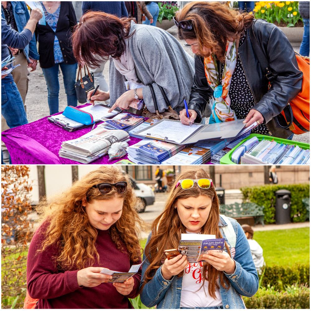 有一群年轻人围着学员来听真相,当他们听到在中国大陆,人们就因为炼法轮功就要被抓进监狱、活着的法轮功学员被盗取器官贩卖时,感到十分的惊愕:“这太可怕了!”都主动在征签表上签字,非常的愿意支持法轮功学员反迫害。