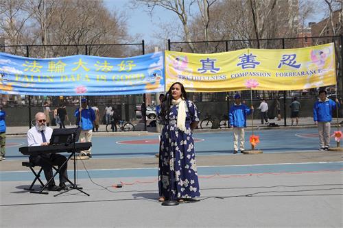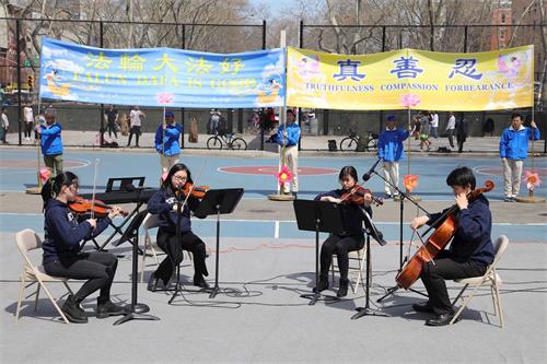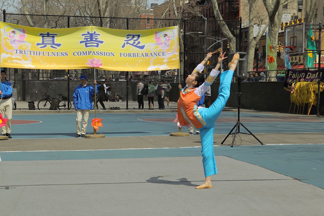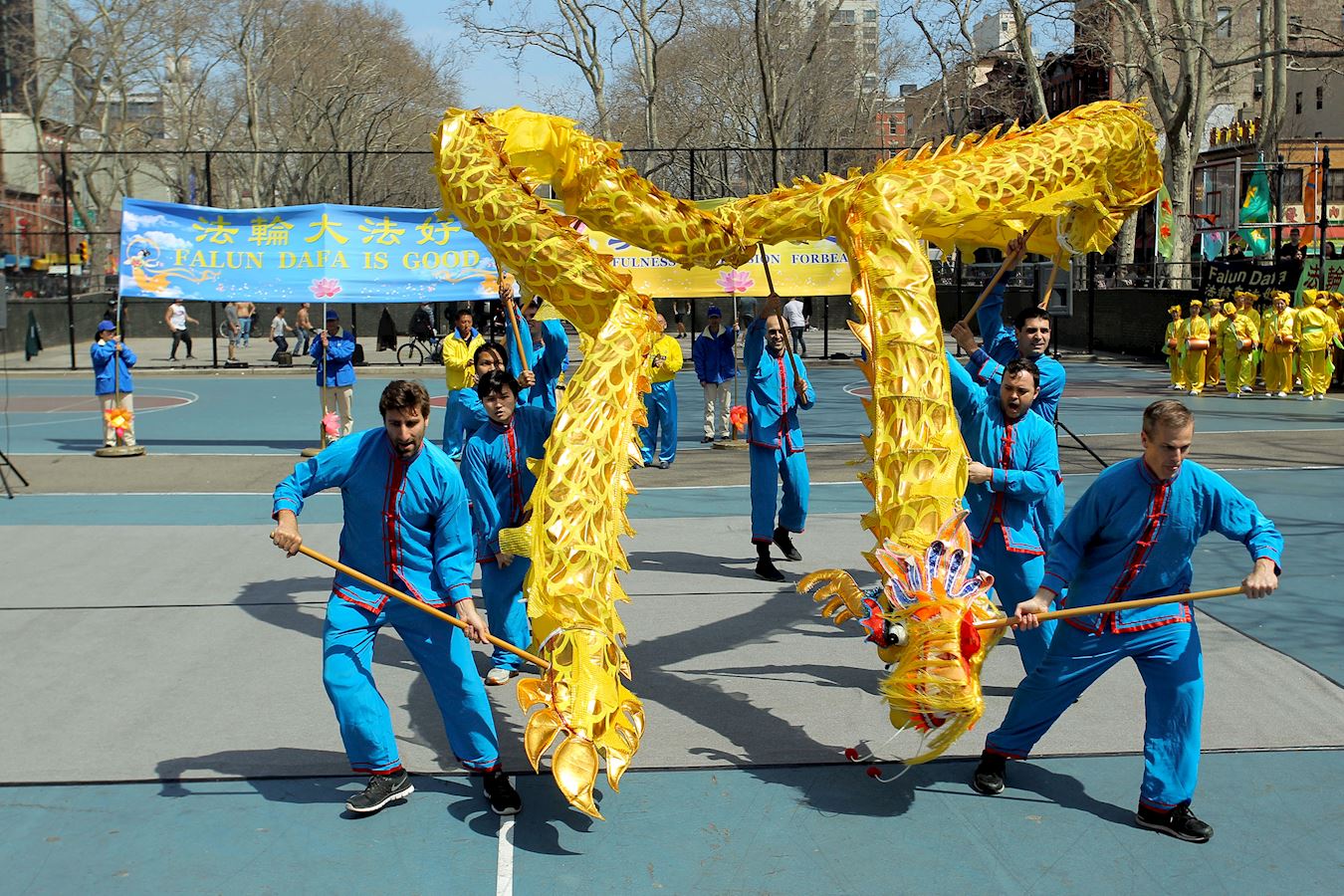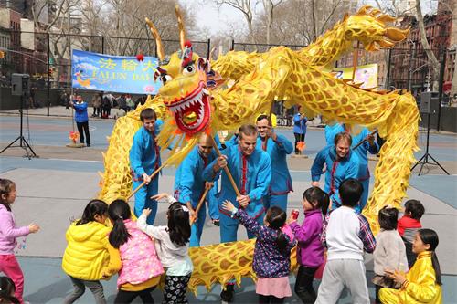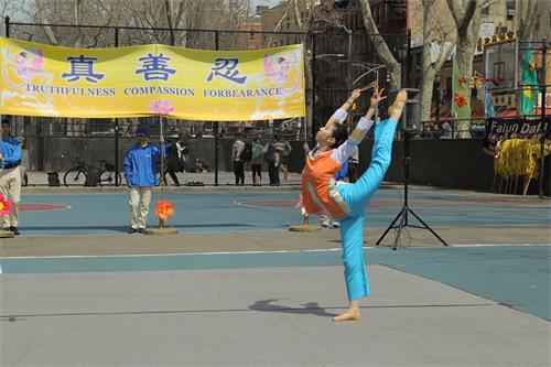 天国乐团雄壮的鼓乐奏响了春天的华章,《法轮大法好》、《神圣的歌》、《星条旗永不落进行曲》等乐曲气势磅礴,响彻天空大地。接下来有舞龙、舞狮、腰鼓、歌曲、舞蹈、乐器演奏、法轮功功法展示等。围观的观众被深深吸引,沉浸在这充满正气与美好的氛围中,不少人当场就跟着学起炼功动作来。