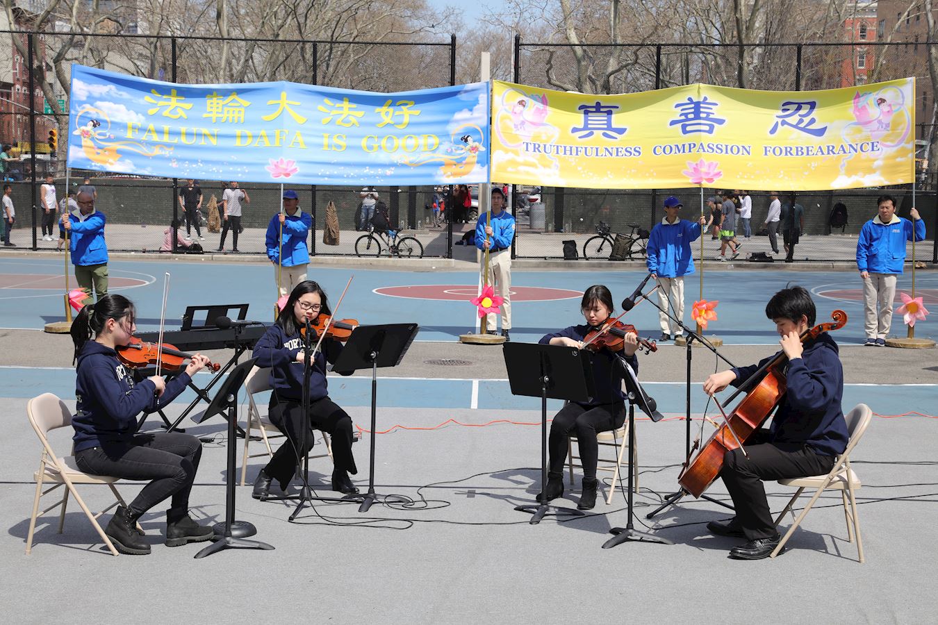 【明慧网二零一九年四月九日】四月的纽约,樱花初放。二零一九年四月七日星期日,阳光明媚,春风佛面,纽约部份法轮功学员来到曼哈顿中国城,在华埠罗斯福公园为民众献上“春天的庆典”,用纯正美好的歌舞表演传递普世价值与中华传统理念,庆祝春天的到来,活动受到华埠民众的热烈欢迎。活动当天,明真相的民众踊跃三:退.。当天就有469人三:退.(声明退出之前参加过的中共党、团、队),其中71人退出党团队,134人退出团队,264人退出少先队。