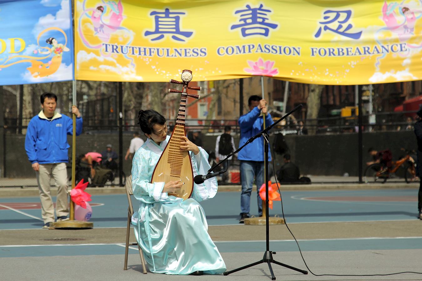 表演《杨门女将》的琵琶手Vivian Liu(中文译名:刘薇薇)介绍:“这首曲子描写的是宋朝杨家男丁战死沙场,女将为国效力,巾帼不让须眉,鼎力护国的故事。我们在演奏这首乐曲时,希望能唤起更多人的良知与正义感。”