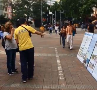 一位姑娘卡棋雅(Katia)看完展板后说:“这个功法我喜欢,我要学。我不能认可中共的打压。我要签字支持你们。”