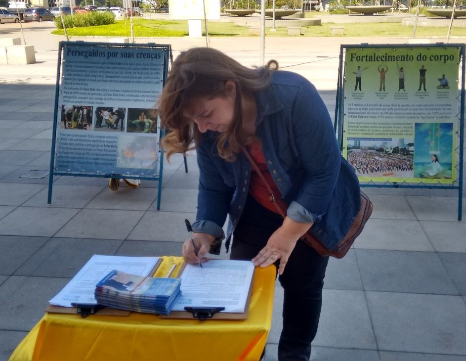 四月二十五日这天,法轮功学员来到巴西利亚市中心的商业区,摆展板,讲真相,并征集反迫害签名。
