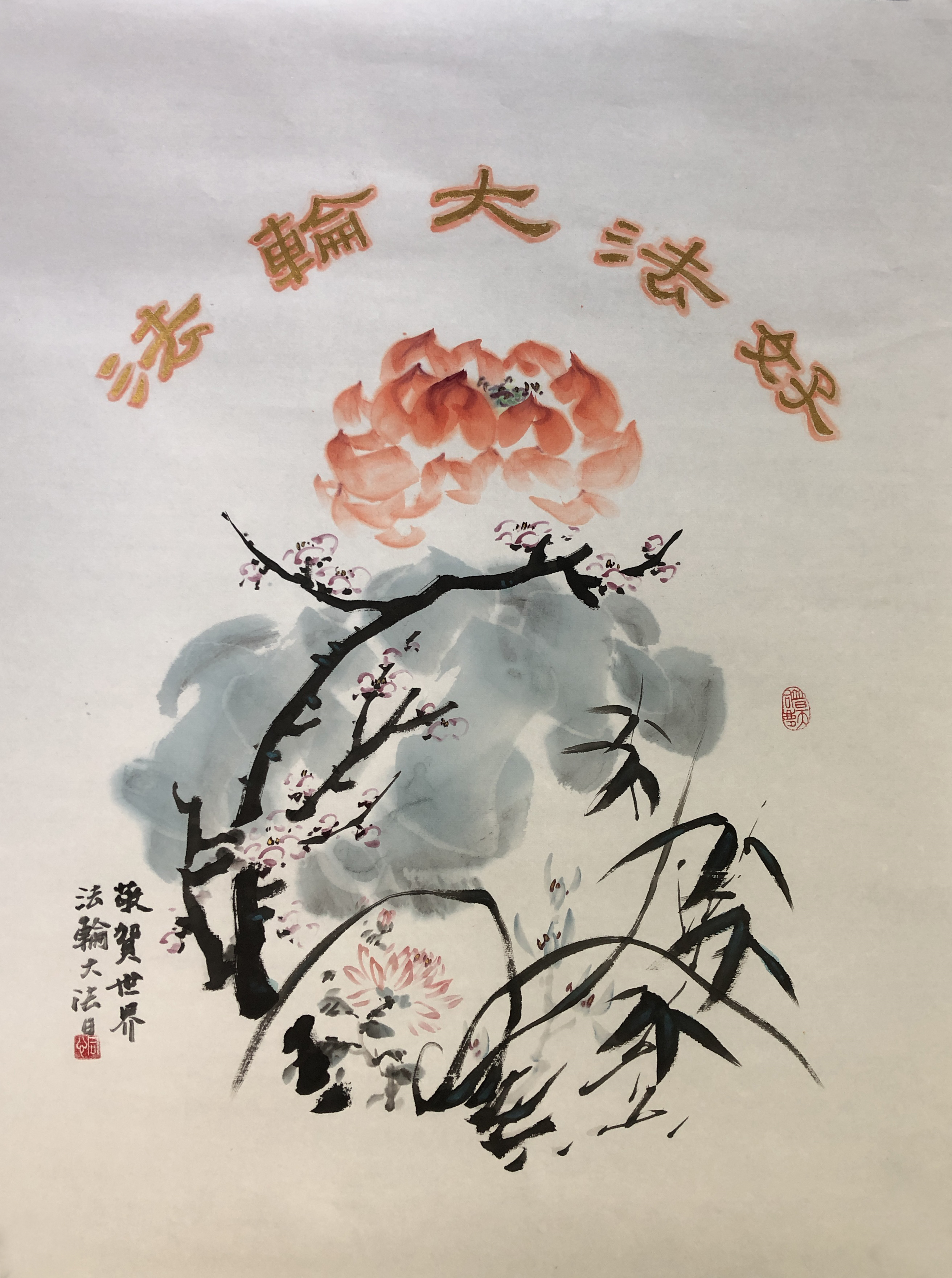 用传统四君子(梅、兰、竹、菊)的画意,溶于出污泥而不染的莲花为一体的笔韵章法。寓意大法弟子从君子好人做起,在大法修炼中相互协调配合,共同精進,整体升华,如出尘的莲花圣洁,化为一言:法轮大法好。