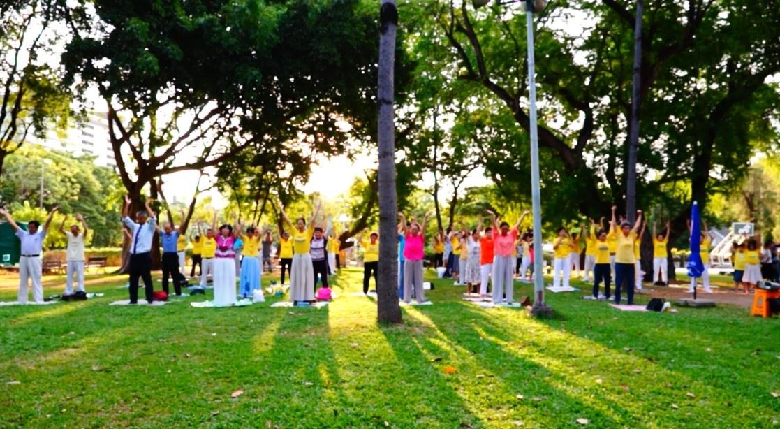 ![]() 图1:二零一九年五月五日晨,泰国法轮功学员在曼谷仑皮尼公园集体炼功 |