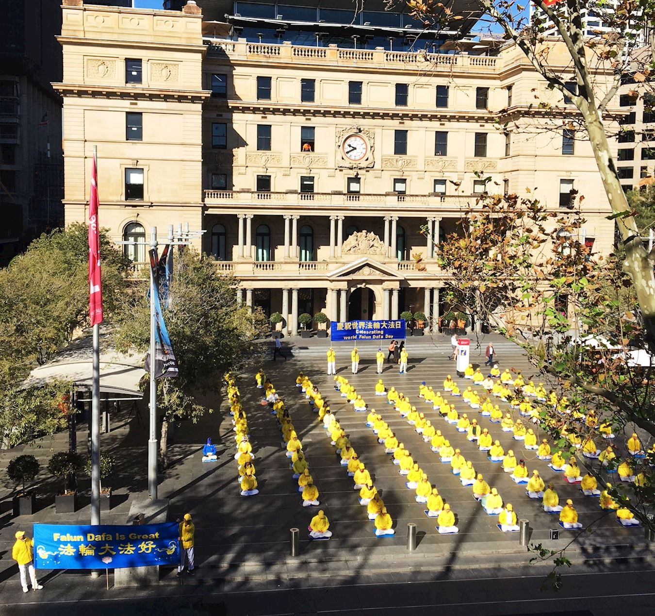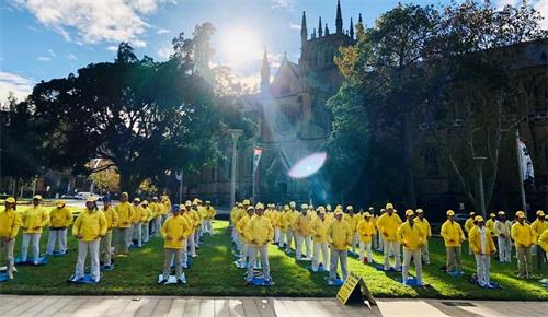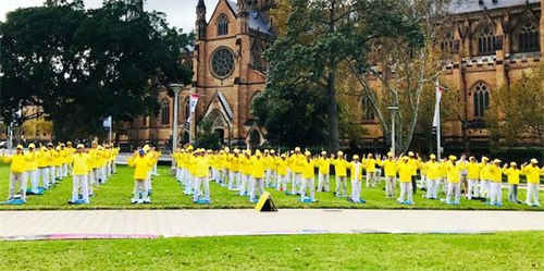 ![]() 图2~3:五月九日,法轮功学员清晨在悉尼市中心海关大楼门前广场集体大炼功 |