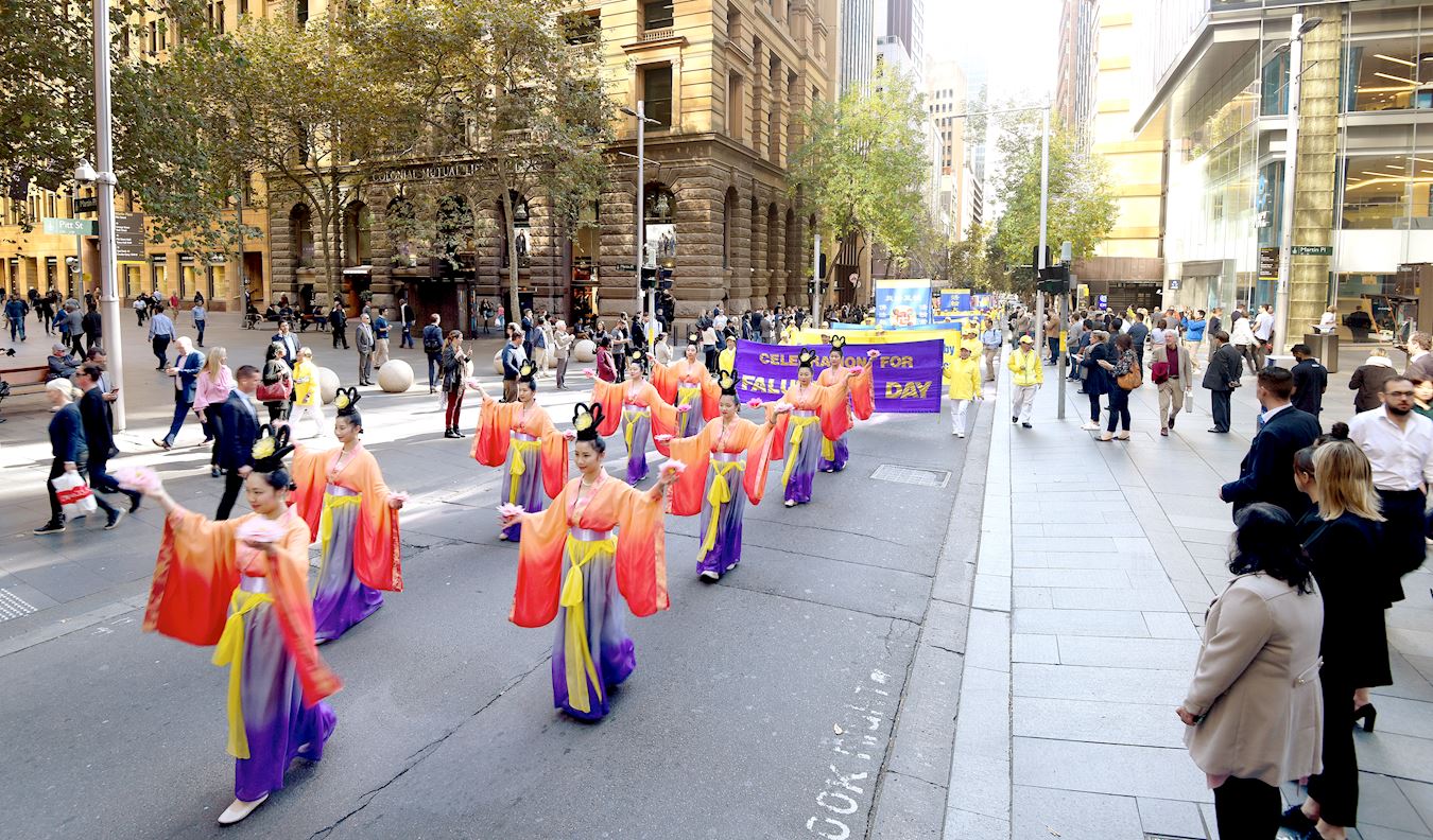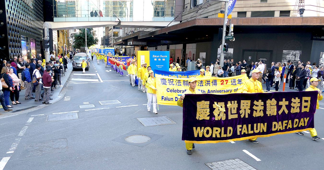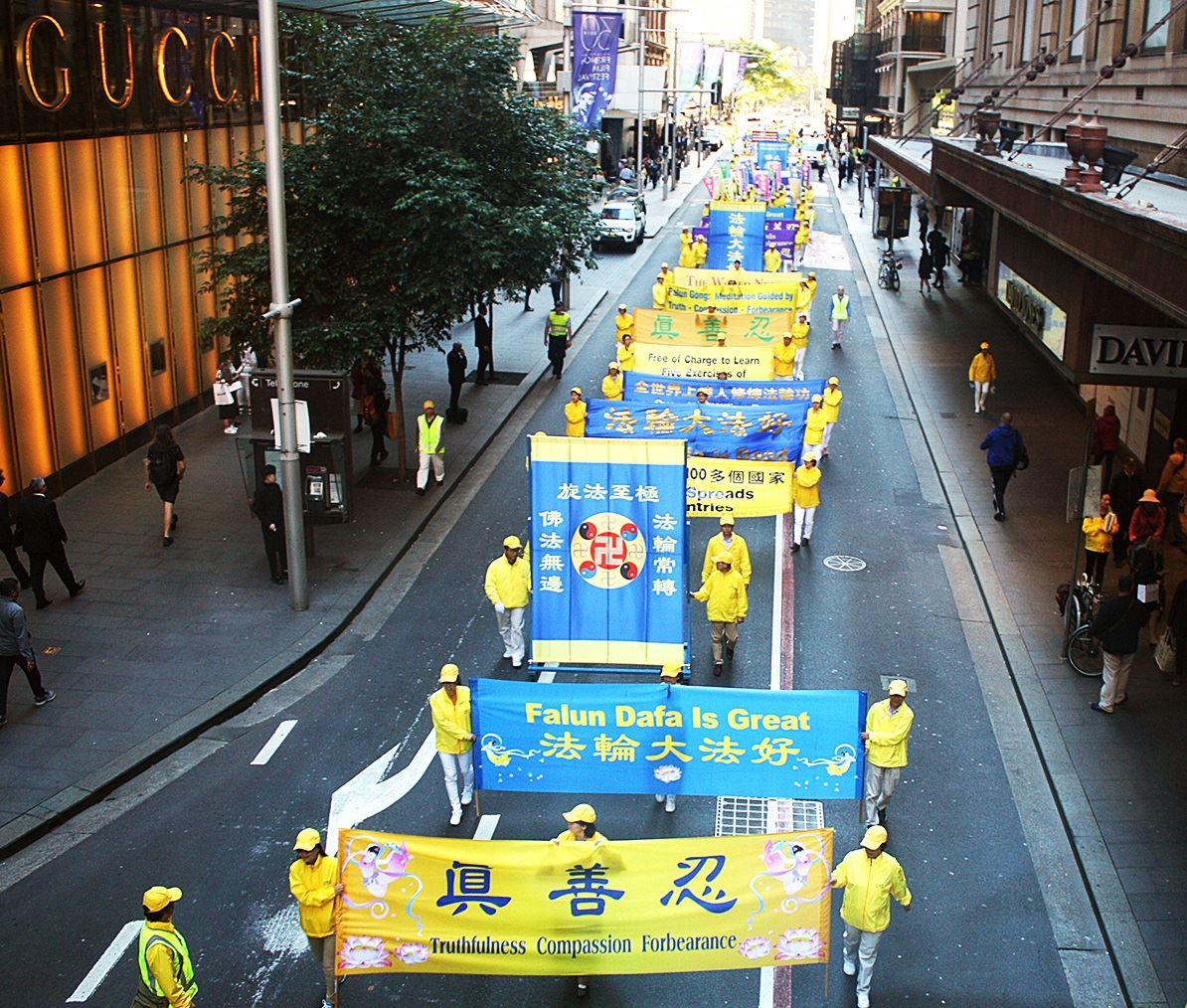 五月九日,法轮功学员在悉尼市中心海关大楼门前广场集体炼功后,由天国乐团领队向市中心主街方向游行,直至贝尔莫尔公园(Belmore Park)。悉尼众多学员怀着对师尊无限的感恩,向师尊遥祝生日快乐!
