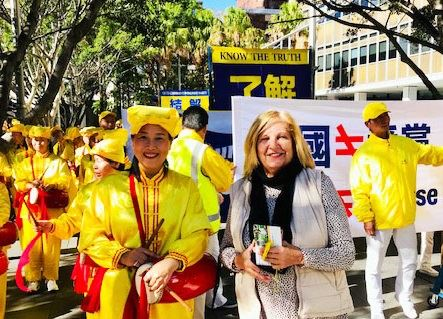 从新西兰来悉尼旅游的心理学家蒂亚·休斯顿(Tia Houston)女士表示:“我看到一群看上去健康纯净的法轮功学员,特别是许多年轻法轮功学员正在用全身心做着他们期望做的事情,我们很喜欢他们所呈现的以及他们所携带的能量。我赞同他们(法轮功)揭露中共迫害法轮功的真相。我认为在这个空间这个时间,这个迫害应该不存在了,因为我们这里是不容忍这种迫害的。我们完全赞同用这种(游行)方式揭露和呼吁制止迫害。我们会去网上了解更多真相,签名支持法轮功反迫害。本周六我们将去海德公园(Hyde Park)支持和欣赏法轮功弘传二十七周年欢庆活动。其实我们都用真善忍在指导我们每天的生活。我们非常喜欢今天法轮功学员所呈现的‘真善忍’的美好,因为这是普世价值。我们需要更多的人站出来,来支持法轮功传播‘真善忍’的美好和反迫害。”