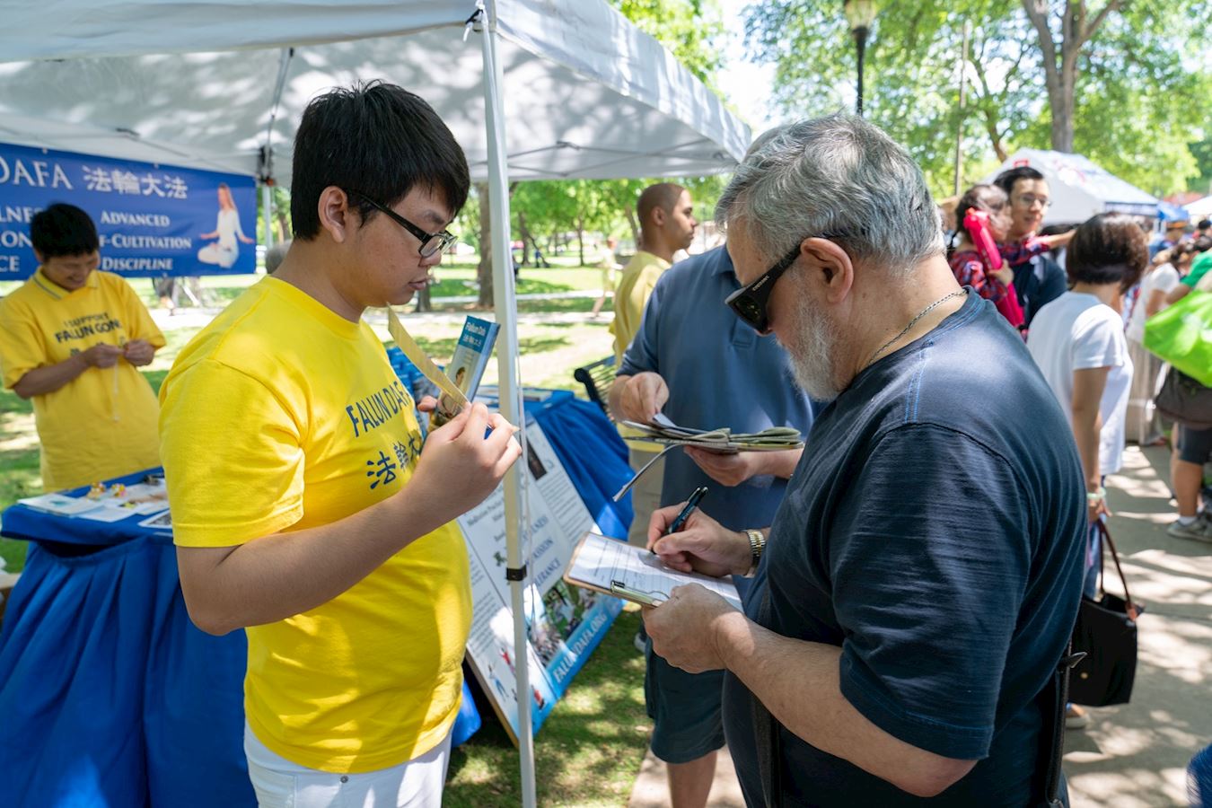 【明慧网二零一九年五月十二日】二零一九五月四日星期六,美国德克萨斯州布兰诺市(City of Plano)的亚洲节(Asia Fest)在市中心的海格特公园(Haggard Park)举行。达拉斯地区的法轮功学员参加了这个活动,向民众介绍法轮大法及曝光中共对法轮功的迫害