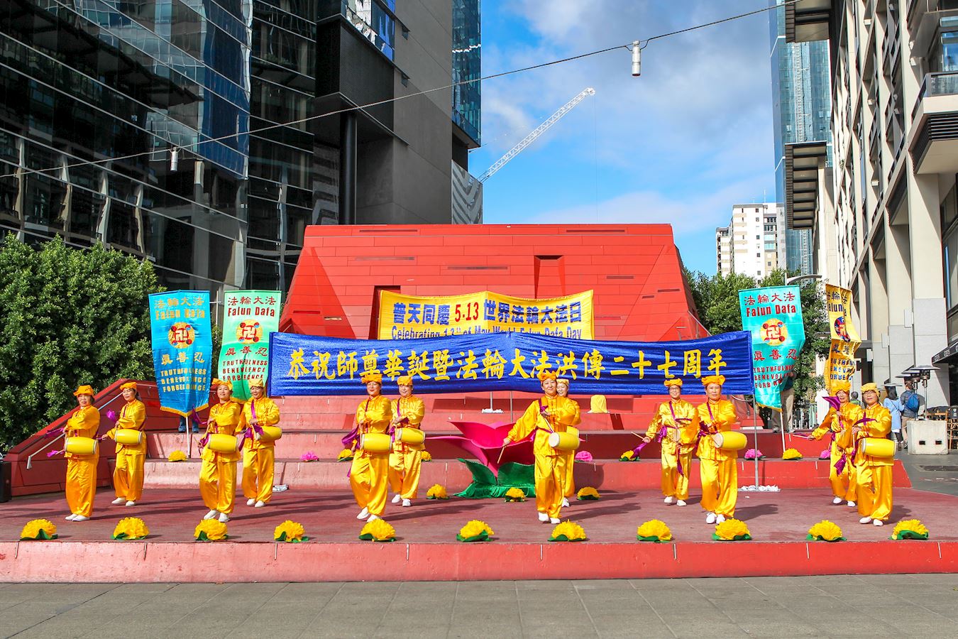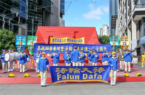 这是墨尔本一周来举办的系列庆典中的一个重头戏。原本预告多云的天气,从天国乐团的乐声响起后,天气由阴暗转为明朗,在灿烂的阳光、湛蓝的晴空下,印有中英文“真、善、忍”的彩旗格外鲜艳,“恭祝师尊华诞暨法轮大法洪传世界二十七周年”的横幅也格外醒目。