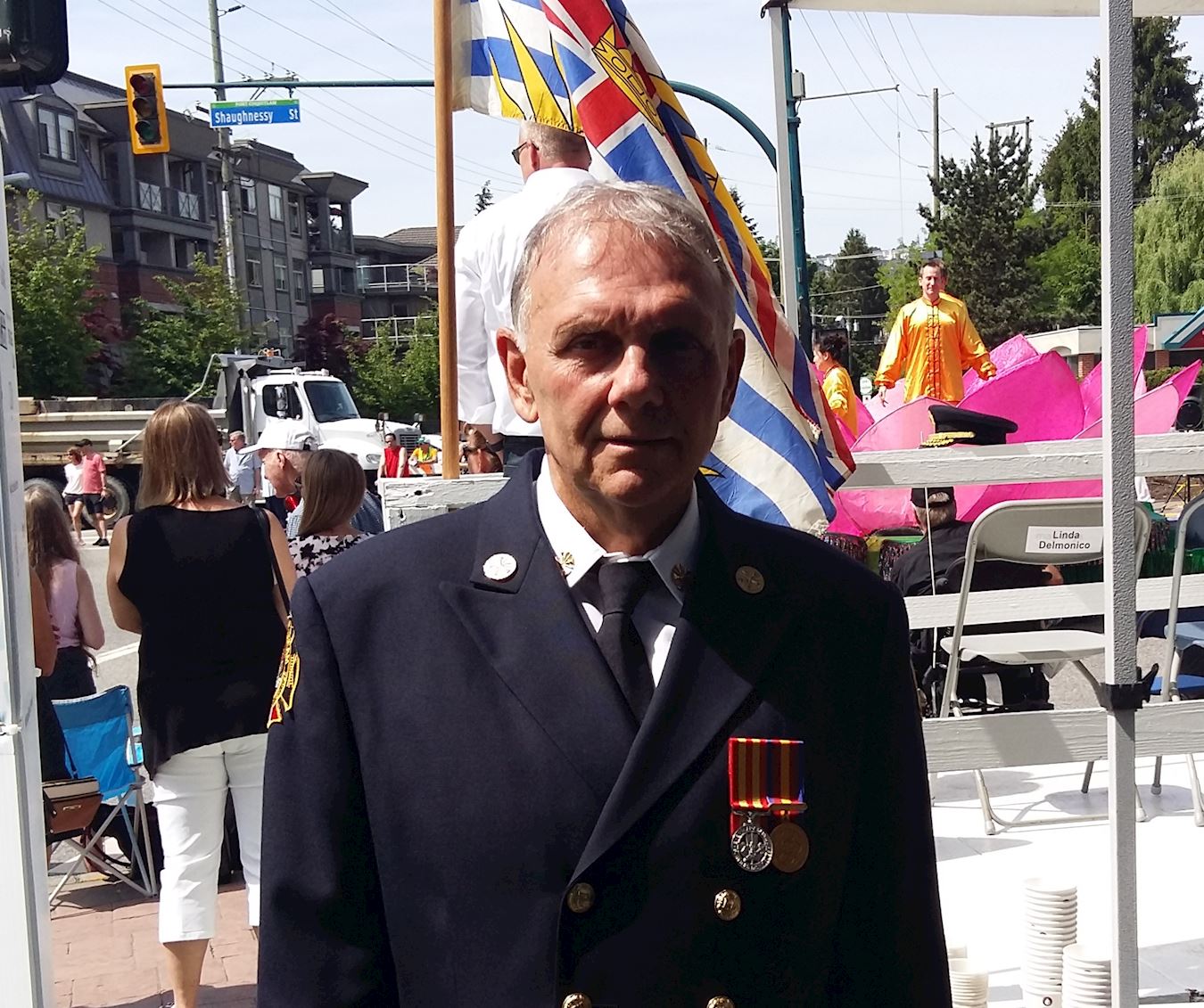 Nick Delmonico是高贵林港市的消防局长,他站在主席台上向游行团队行礼致敬,他表示五月节游行对高贵林港市是非常重要的事件,全市的主要商业,行政,消防,各个社区都派出了团队来参加游行。他很高兴在游行中看到法轮功团体给高贵林港市带来中国传统文化,他感谢法轮功的团体为社区带来美好体验。