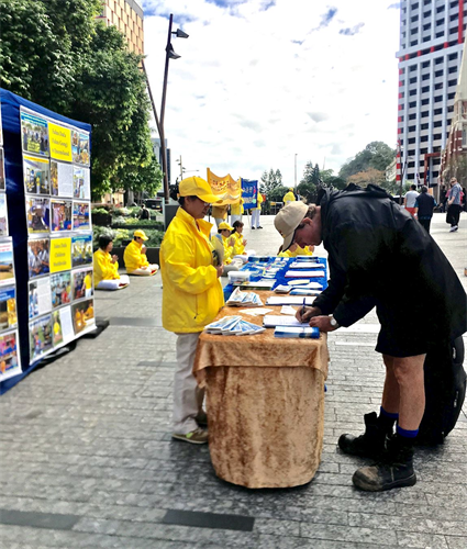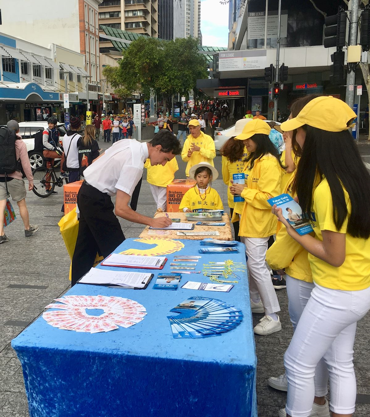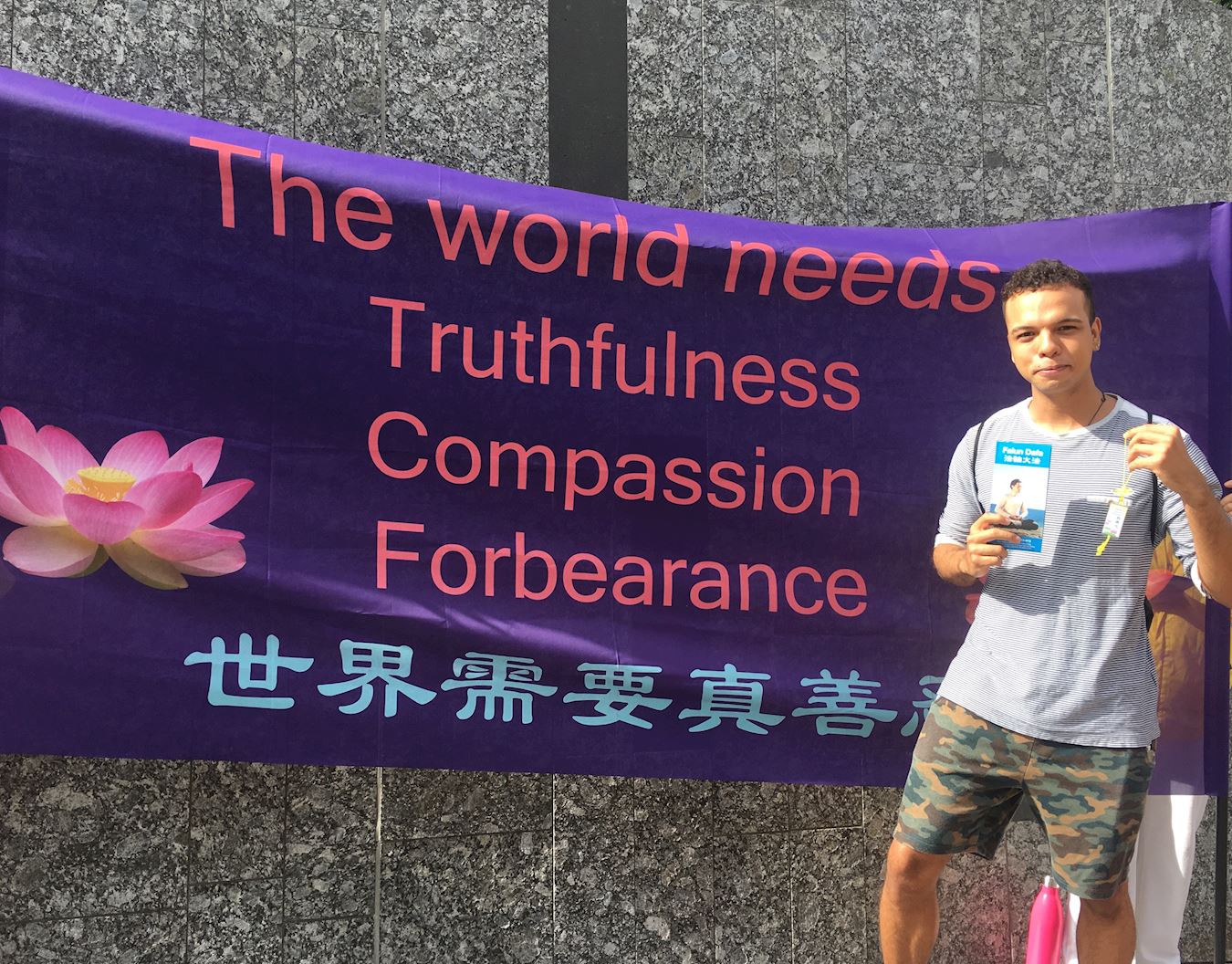 来自巴西的一名青年,是中国功夫的爱好者,他接到法轮功学员的真相传单后,主动停下来了解更多信息。当得知中国大陆有很多法轮功学员因为信仰“真善忍”被迫害时,他很难过,并问学员他可以做点什么。随后他在征签簿上签名支持法轮功,并说他希望帮助中国人了解法轮功在海外受到很多国家人民的支持。