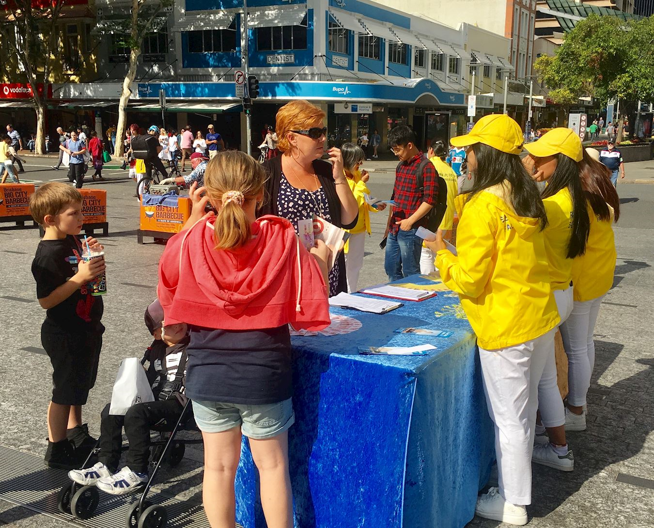 一位西藏女士带孩子经过法轮功的展位,看到这法轮功学员和平反迫害的场景深有感触。她说自己非常幸运,十三岁的时候就逃离中国来到澳洲寻求庇护。在中国很多信仰团体都受到迫害,中共对西藏的迫害也非常严重,现在还在发生。当得知中国的法轮功学员被中共活体摘取器官后,她对学员受到的残酷迫害深表同情。学员还向她介绍了三:退.大潮,这位女士小时候戴过红领巾,学员就送给她一个美丽的名字“卓玛”,帮助她抹去毒誓,远离中共,她非常高兴。临离开时,她动容地说:希望有一天我们这些受到迫害的人都能重新回到中国,不再四处流亡,不再和家人分离。