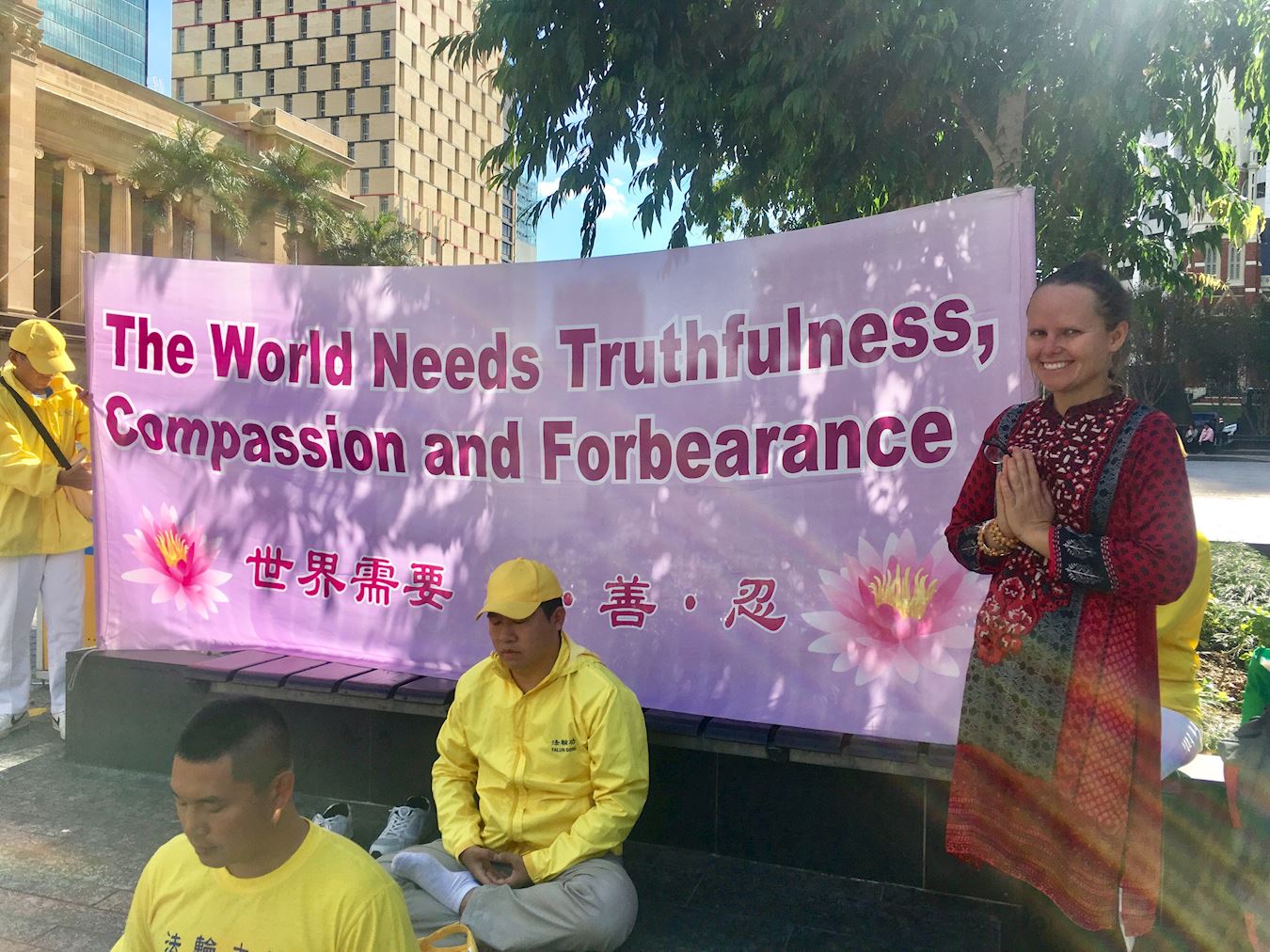 来自汤斯维尔(Townsville)市的教师斯蒂芬妮(Stephanie)看到法轮功祥和的功法时感触很深,不由得也加入了炼功行列。学员耐心地教她第五套功法的动作,学完后她又继续跟着炼动功,整个过程她一直面带微笑,感到非常祥和。她两年前在印尼的时候,第一次接触到法轮功并跟着炼了一次。这是她第二次与法轮功结缘。她说非常喜欢法轮功,感到能量很强。当听说法轮大法日也是法轮功创始人李洪志先生的生日时,她非常高兴能参加当天的庆祝活动,同时希望更多的中国人能够了解法轮功的真相。斯蒂芬妮在活动场地徘徊了很久才依依不舍地离开。