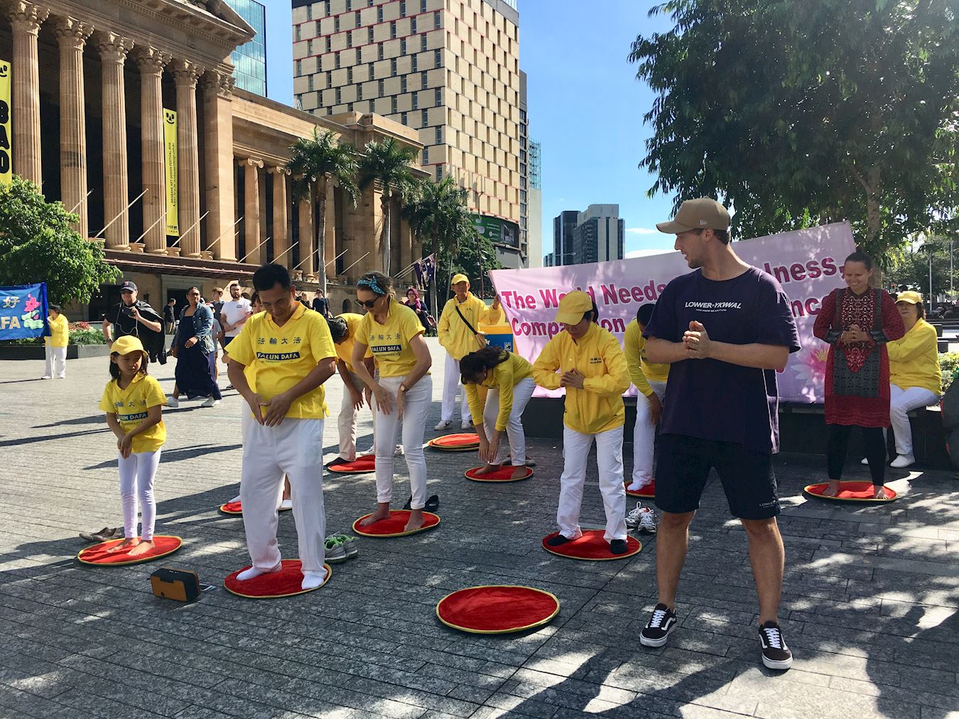澳洲本地青年学生艾赛克(Isaac Williams)远远看到功法展示,很感兴趣,就跟朋友跑过来观看,并在学员的鼓励下学炼法轮功,他学得非常认真。了解到法轮功被中共迫害时,他感到不解与震惊,并表示非常同情并支持法轮功学员。