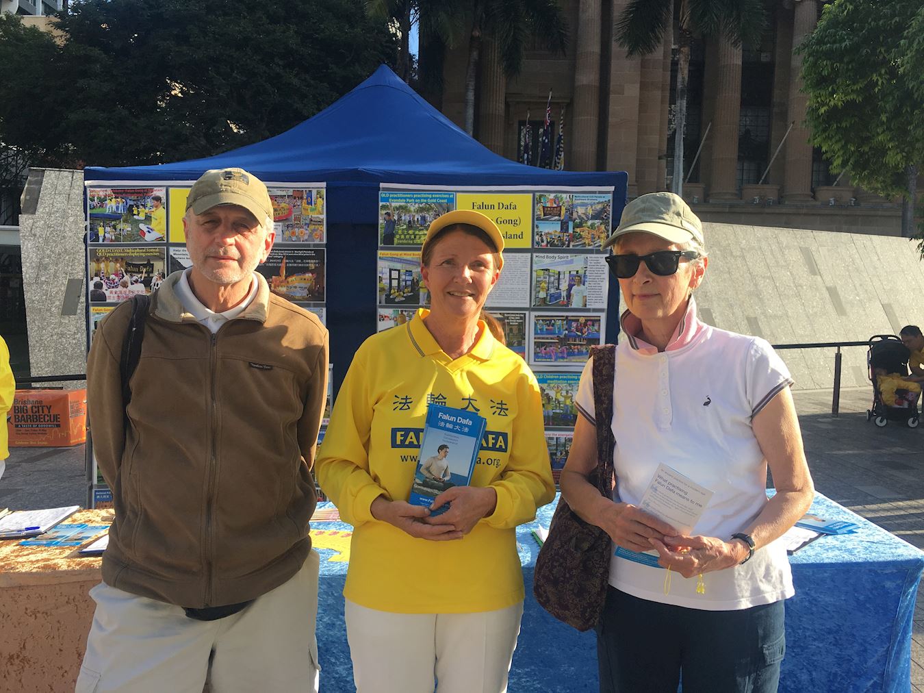 简(Jan)和吉姆(Jim)是一对来自墨尔本的夫妇,他们刚搬到昆士兰不久。当天路过乔治广场,被法轮功学员的功法所吸引。跟西人学员阿曼达(Amanda)交谈后,对学炼法轮功很感兴趣,他们说能感到功法的平和及能量。