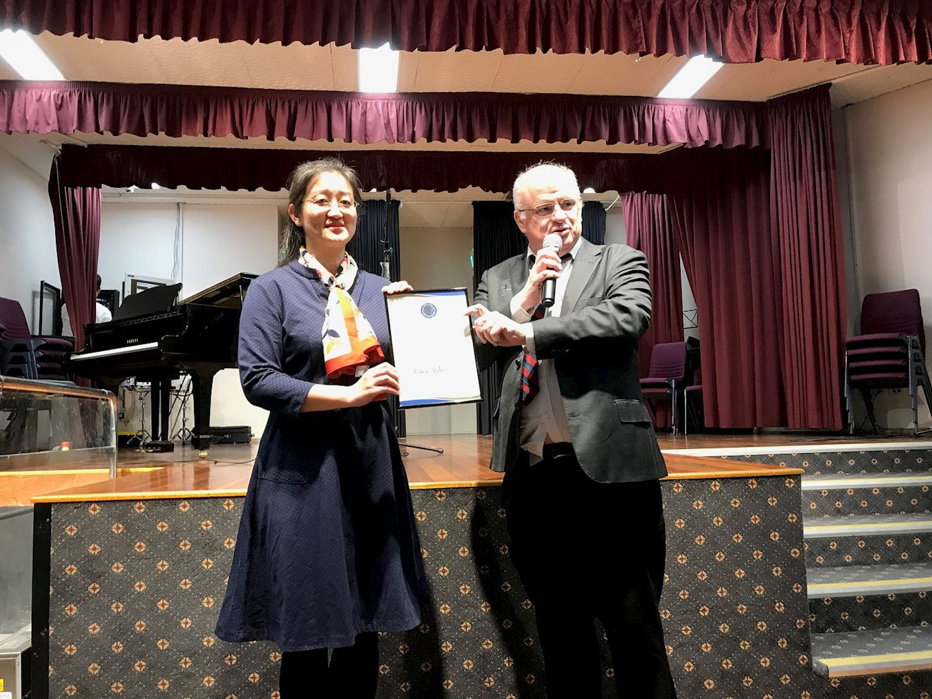 ![]() 图4:悉尼帕拉马塔市长威尔逊(右)向澳洲法轮大法佛学会会长赵博士(左)颁发了褒奖令,表彰法轮大法为当地社区所作出的贡献,并祝贺法轮大法弘传世界二十七周年。 |