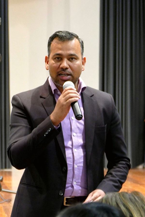 ![]() 图5:五月三日在北莱德(North Ryde )社区中心庆祝法轮大法日活动时Parramatta市议员潘迪(Sameer Pandey)在发言 |