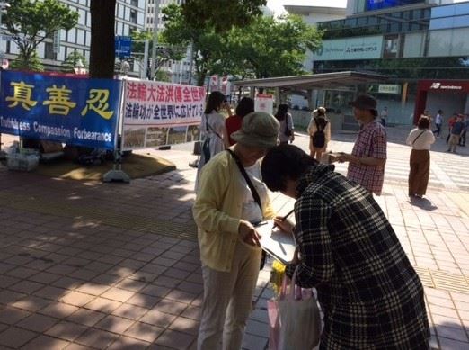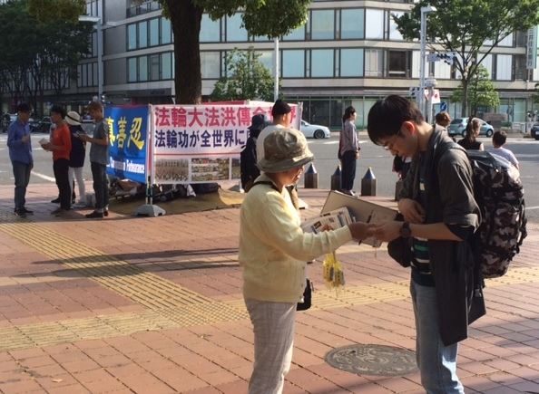 一位女士在“法轮大法弘传世界”的横幅前观看上面的世界各地的彩色炼功图片。学员和她交谈,得知她今年已经七十多岁了,从北京到日本来旅游。她的亲戚中有人炼法轮功,还遭受过迫害。学员问她是否听说过“三:退.”(退出中共党团队组织),并向她介绍了为什么要“三:退.”。她说她家出身不好,没入过党,入过共青团和少先队。学员对她说,可以用笔名小名化名声明退出去,她就说了自己的一个化名,声明退出以前入过的团队,并向学员表示感谢。学员让她回国后替海外的法轮功学员向她在国内修炼的亲戚问好,她愉快的答应了。