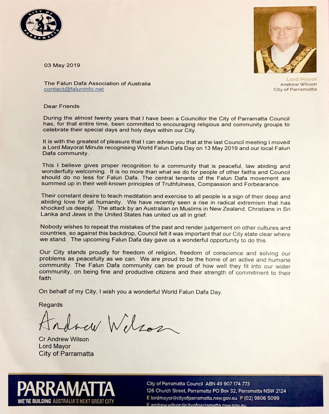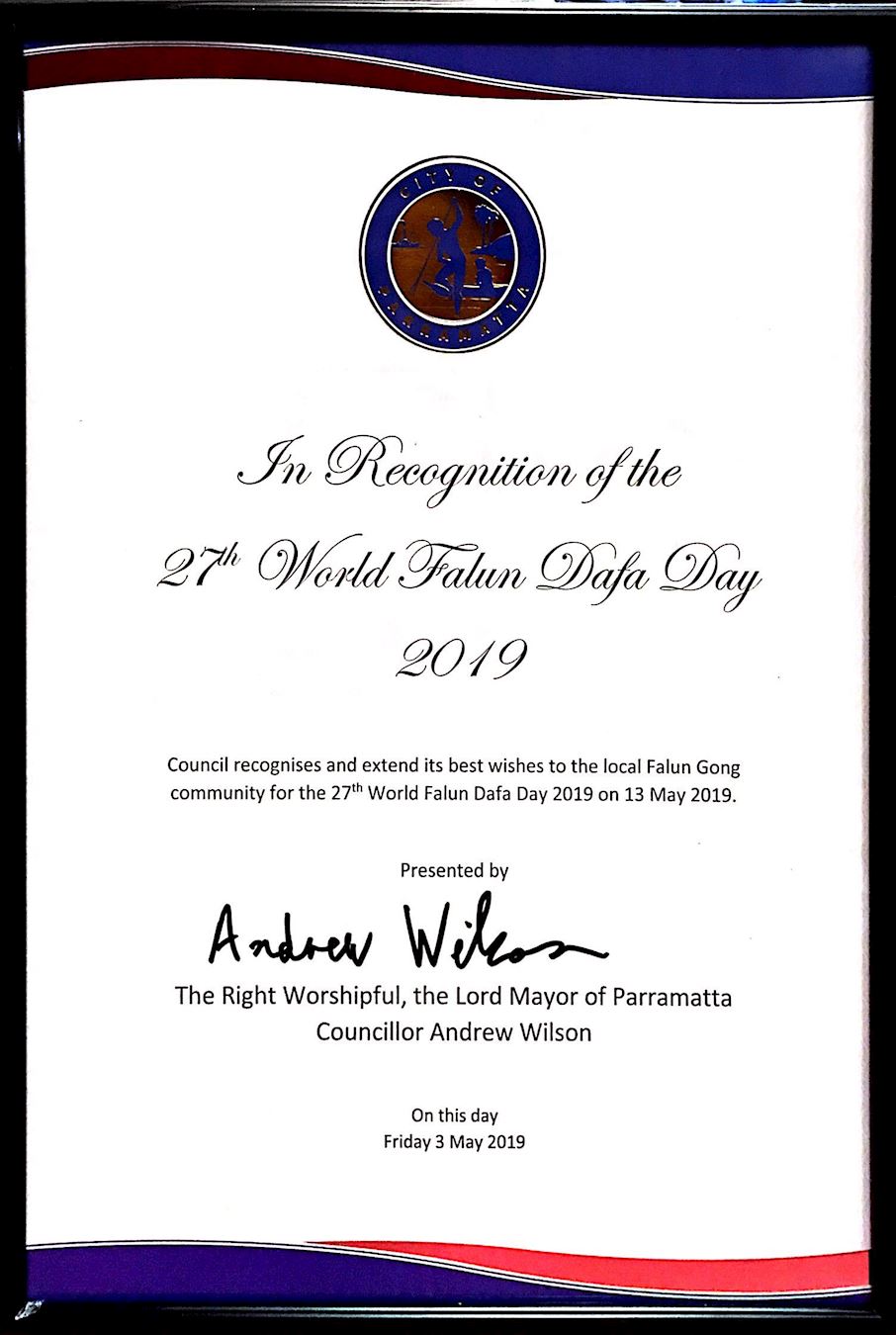 悉尼帕拉马塔市长安德鲁·威尔逊(Parramatta Lord Mayor Andrew Wilson)于二零一九年五月在悉尼举办的两次法轮大法日庆典活动中都代表他所在城市副市长米歇尔·加拉德(Deputy Lord Mayor Cr Michelle Garrard),市议员安德鲁·杰弗里斯(Cr Andrew Jefferies),市议员比尔·泰瑞尔(Cr Bill Tyrrell),市议员鲍勃·德怀尔(Cr Bob Dwyer),市议员唐娜·戴维斯(Cr Donna Davis),市议员帕特丽夏·帕烙希博士(Cr Dr Patricia Prociv),市议员洛林·沃恩(Cr Lorraine Wearne) ,市议员马丁·扎伊特(Cr Martin Zaiter),市议员菲尔·布拉德利(Cr Phil Bradley),市议员皮埃尔·埃斯伯(Cr Pierre Esber),市议员萨米尔·潘迪(Cr Sameer Pandey),市议员史蒂文·伊萨(Cr Steven Issa JP)一起向法轮大法团体颁发褒奖令以及褒奖信,祝贺法轮大法弘传世界二十七周年,恭祝李大师生日快乐!并表彰法轮大法为当地社区所作出的贡献。
