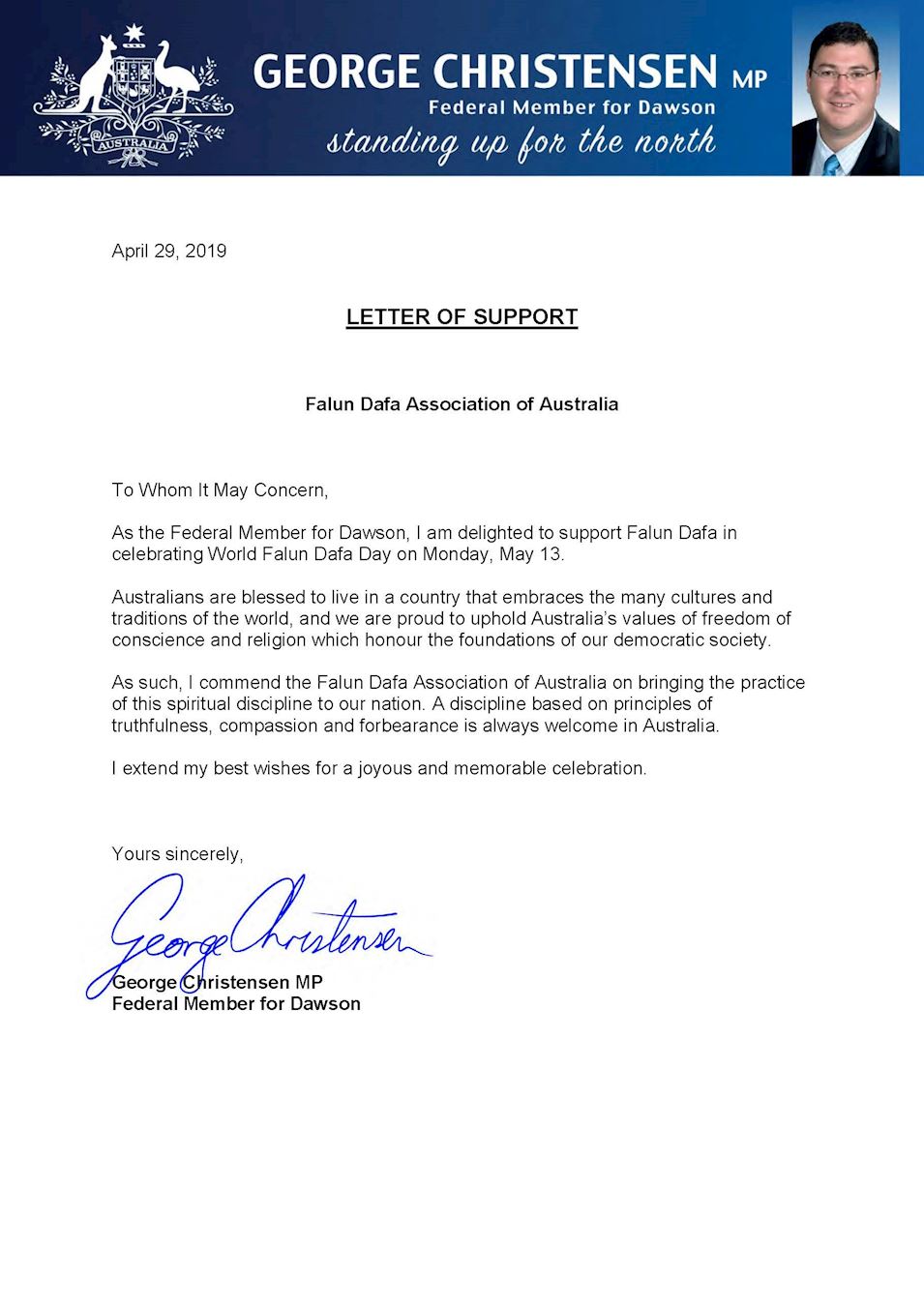 昆士兰道森(Dawson)选区联邦议员克里斯滕森(George Christensen)给澳大利亚法轮大法学会发来支持信: