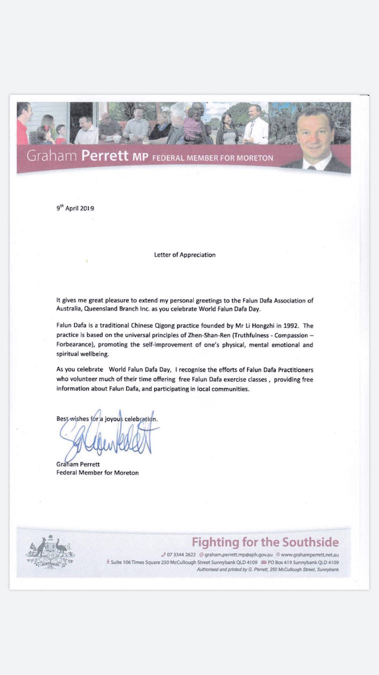 ![]() 图7:昆州工党 Moreton选区联邦议员佩雷特(Graham Perrett)给昆州法轮大法学会发来感谢信,祝贺法轮大法弘传二十七周年。 |