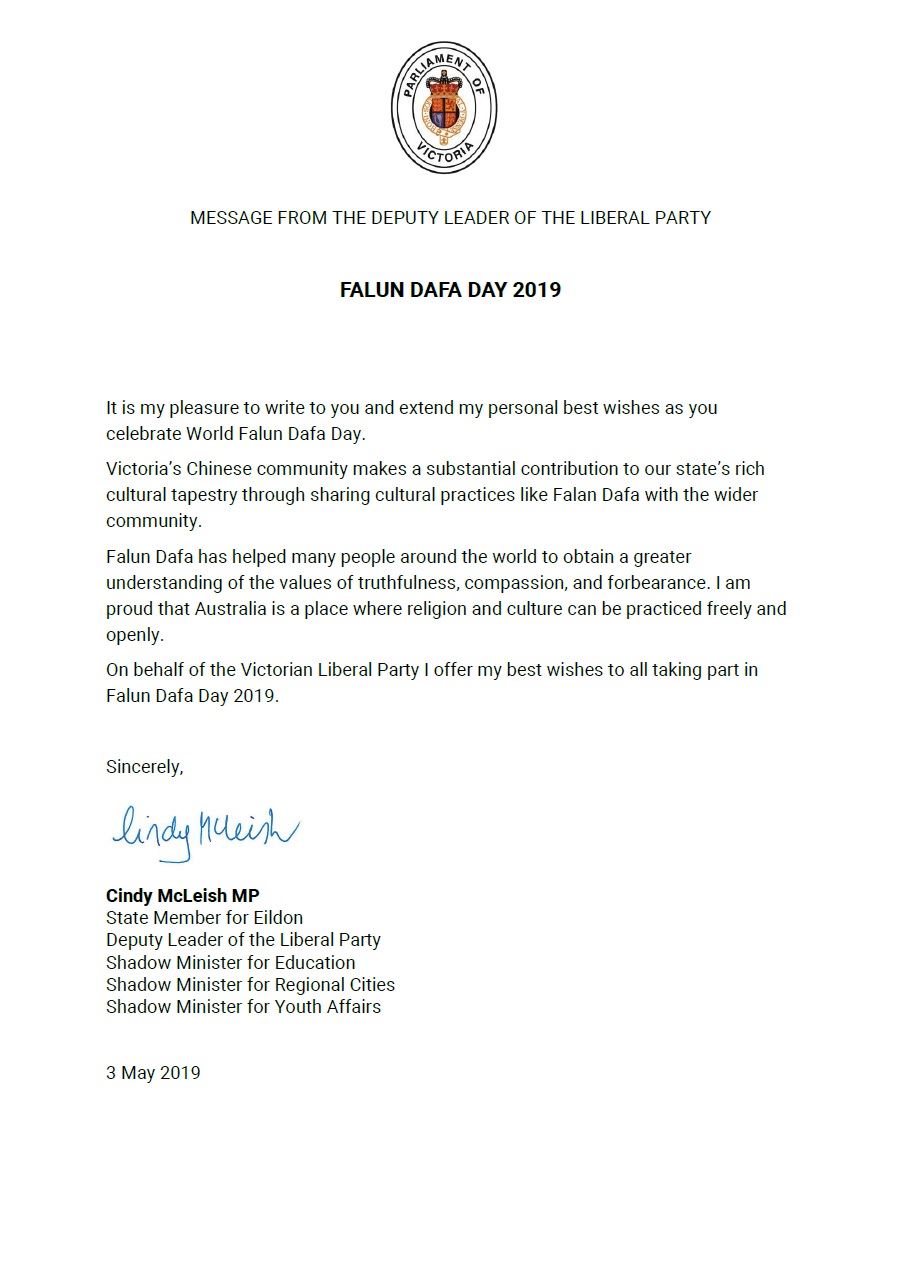维州自由党副领袖辛迪·麦克利什(Cindy McLeish)的贺信译文如下: