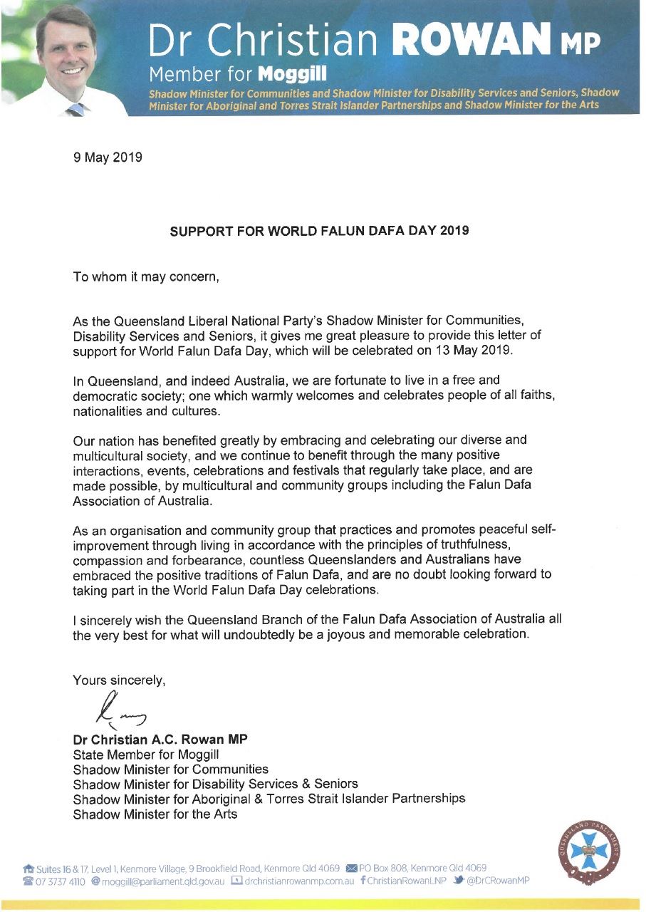 作为昆士兰自由党的社区影子厅长,残疾服务和老年人影子部长,我很高兴为二零一九年五月十三日庆祝世界法轮大法日活动提供这封支持信。