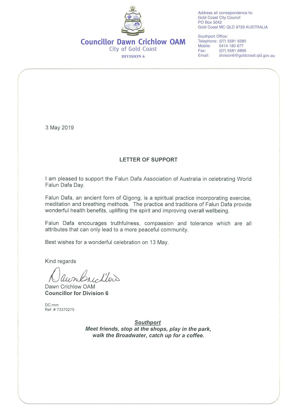 ![]() 图4:澳洲勋章得主、黄金海岸市第六选区市议员克里奇洛(Dawn Crichlow)给昆州法轮大法学会发来贺信,祝贺法轮大法洪传二十七周年。 |