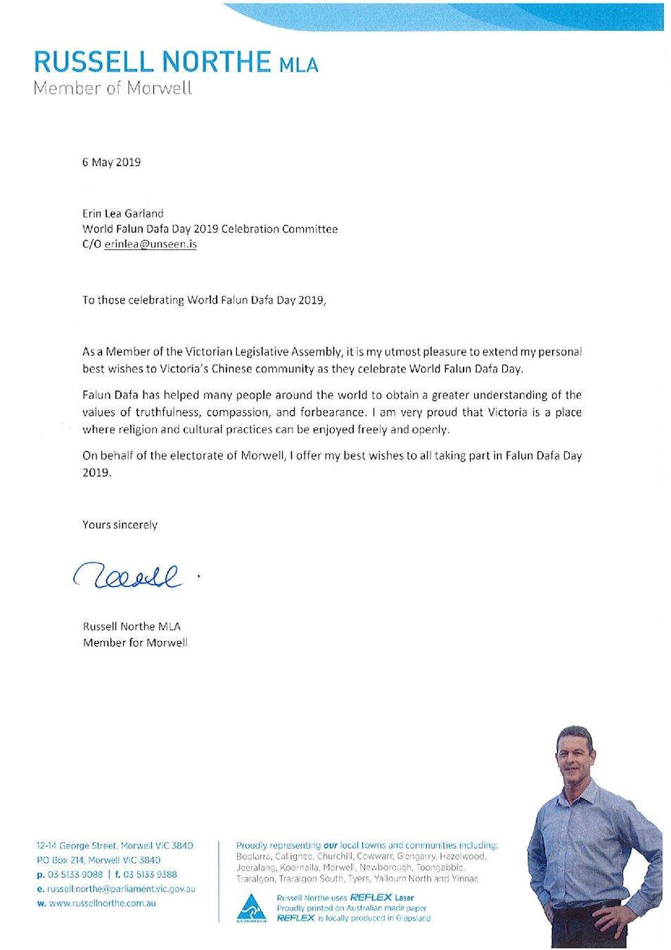 维州Morwell选区州议员诺斯(Russell Northe)的贺信全文如下: