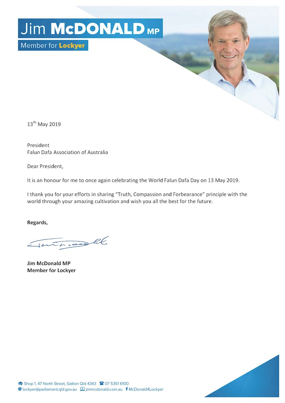 ![]() 图8:昆州Lockyer选区议员麦克唐纳(Jim McDonald)向法轮大法学会发来贺信。 |