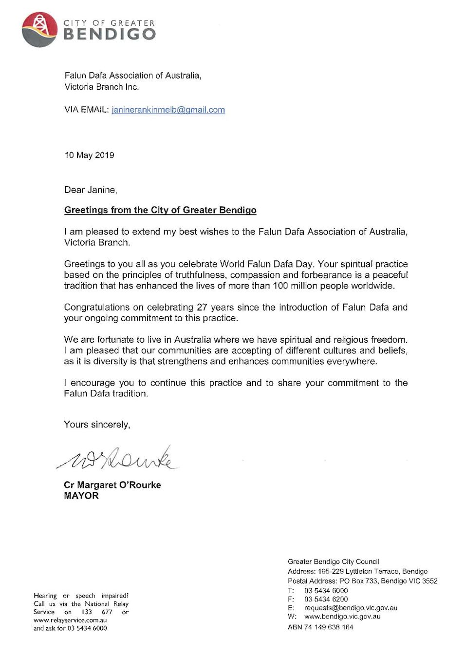 大本迪戈(Greater Bendigo)市市长奥罗克(Margaret O’Rourke)在信中说: