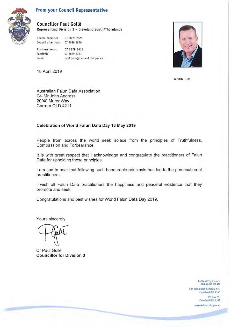 我非常高兴能以这封信表达对世界法轮大法日的支持。作为Alexandra Hills、Capalaba和Thornlands的议员,我认为身体及心灵的升华对个人健康是有益的。
