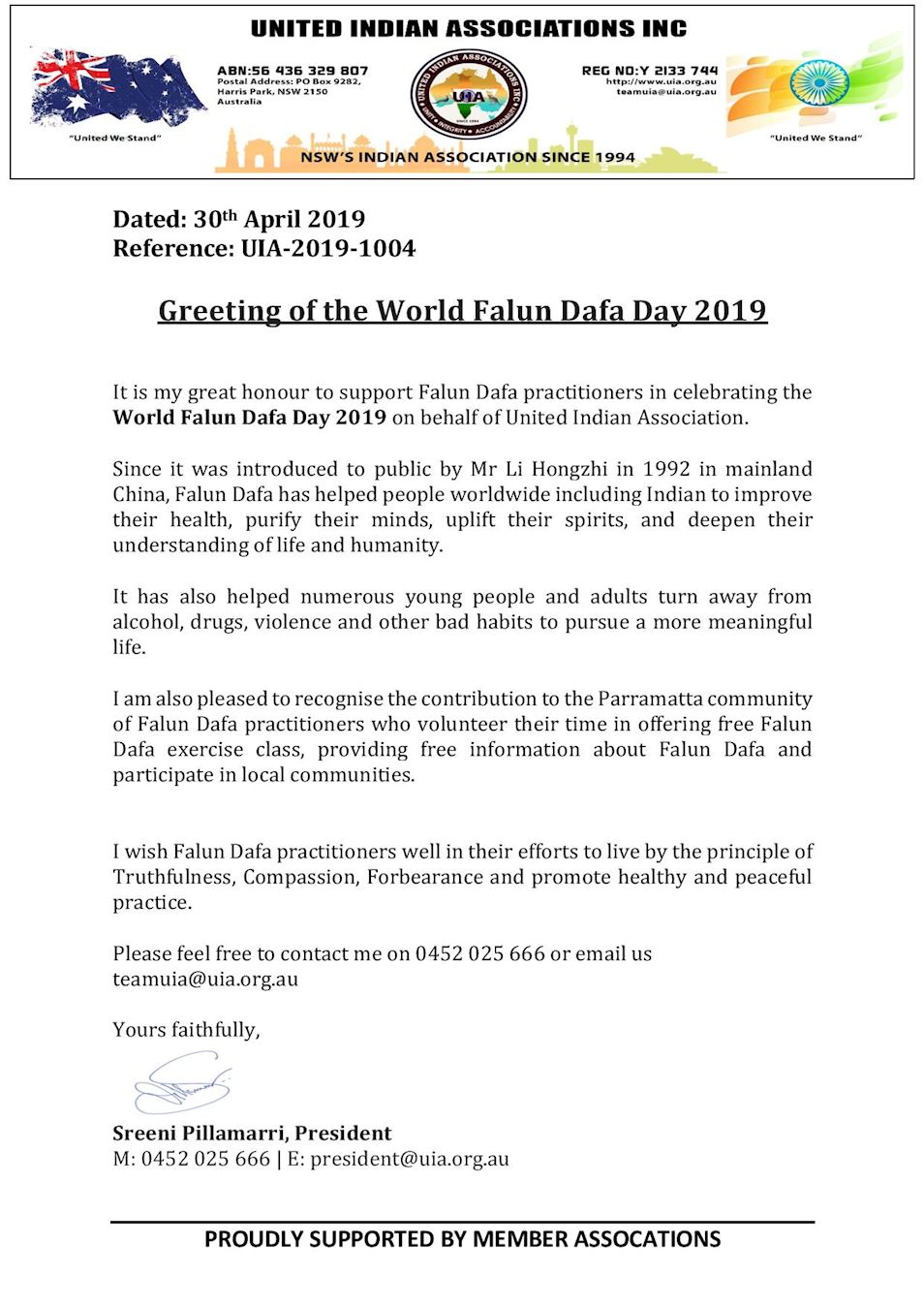 ![]() 图23:新州印度联合会(UIA)会长皮拉马力(Sreeni Pillamarri)发来贺信恭祝世界法轮大法日。 |