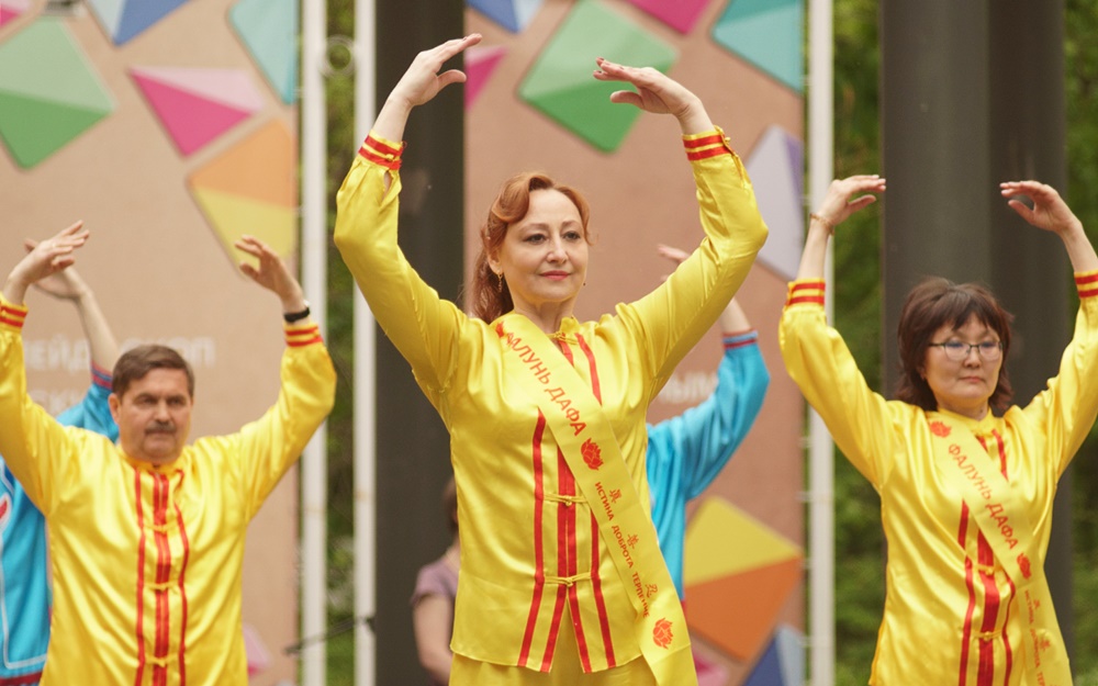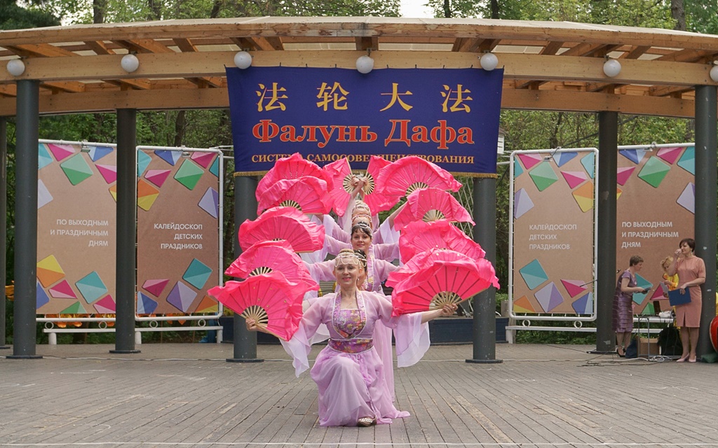 图10: 在莫斯科素科尔尼基公园(Sokolniki park)法轮功学员功法展示