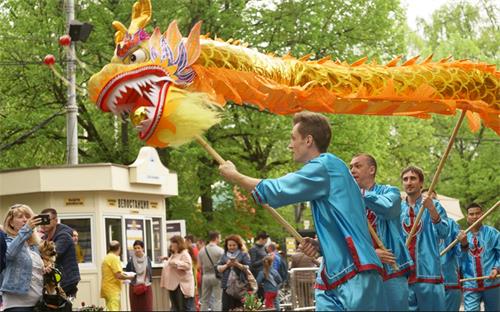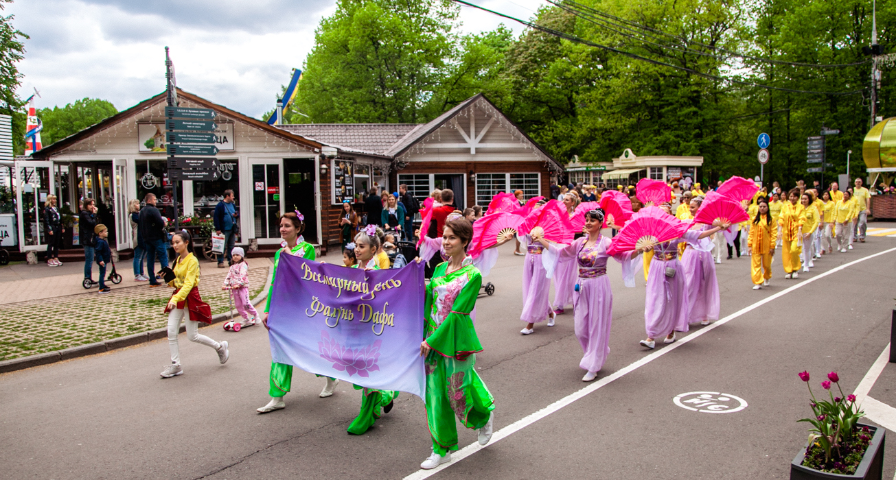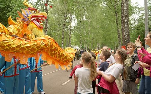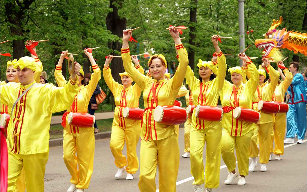 图8~9:在莫斯科素科尔尼基公园(Sokolniki park)法轮功学员载歌载舞的游行