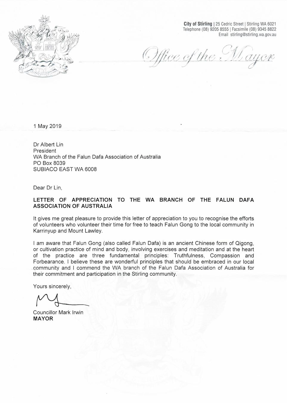西澳斯特灵市(City of Stirling) 市长马克·欧文(Mark Irwin)写信给西澳法轮大法学会,表彰法轮大法学员对社区的贡献。欧文市长表示他相信法轮功真善忍的原则在社区是会被欣然接受的。