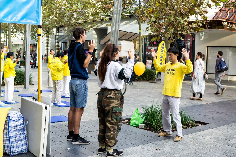当天有非常多的民众喜得法轮大法的讯息,也有民众现场开始学功。法轮功学员们全天的炼功活动吸引了许多民众的瞩目。