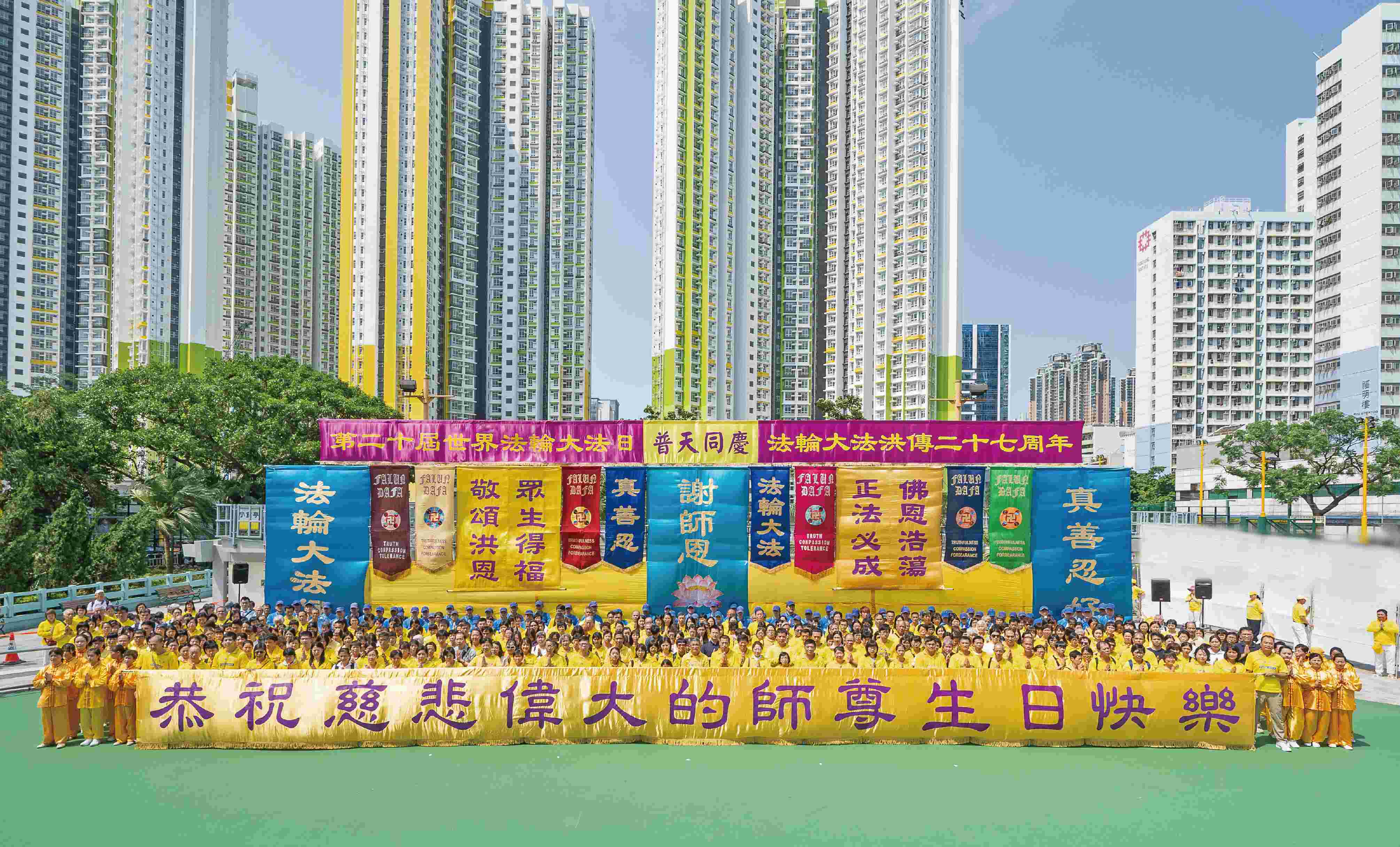 经过近一周的阴雨天气,当天迎来风和日丽、阳光普照的日子,香港及来自外地的部份法轮功学员,一早在长沙湾游乐场随着祥和的音乐炼功。上午九时半后,随着天国乐团及腰鼓队先后向师尊敬献鼓乐表演拉开庆祝集会的序幕,学员们双手合十,齐声恭祝师父生日快乐,敬谢师父救度洪恩。接着齐唱《法轮圣王》、《得度》、《来归行》、《法轮大法好》等多首大法弟子歌曲,在欢乐的鼓掌声中结束早上的活动。