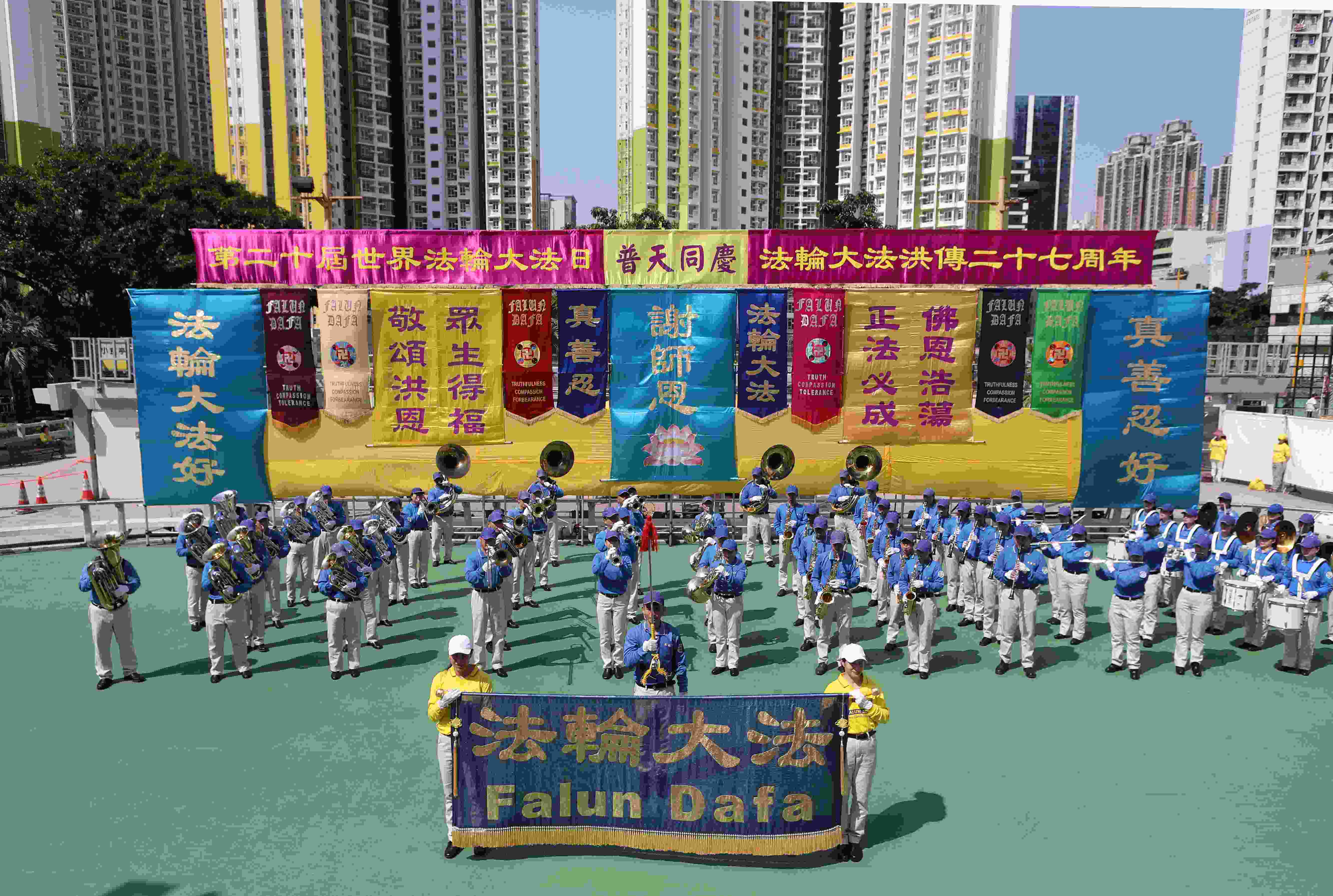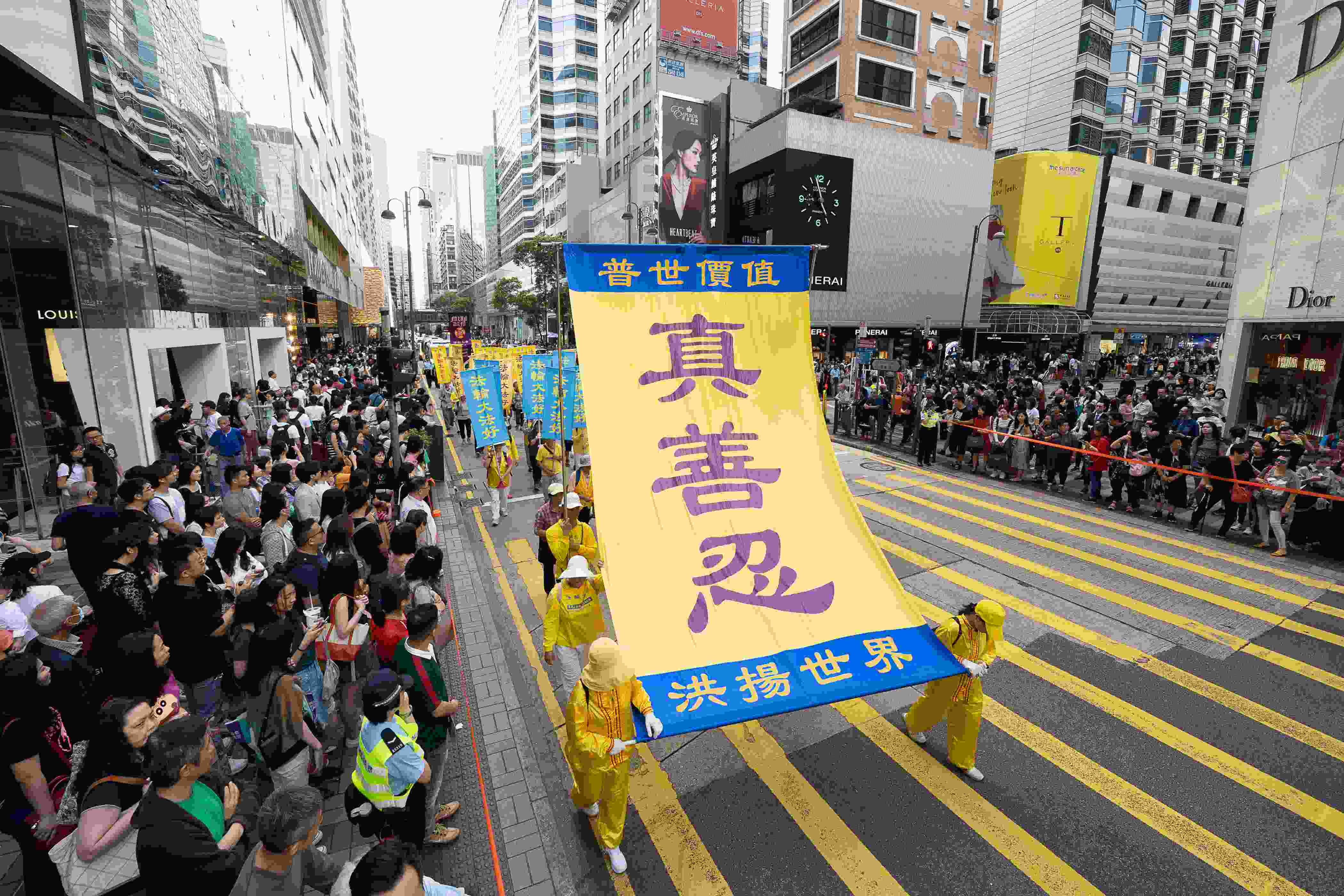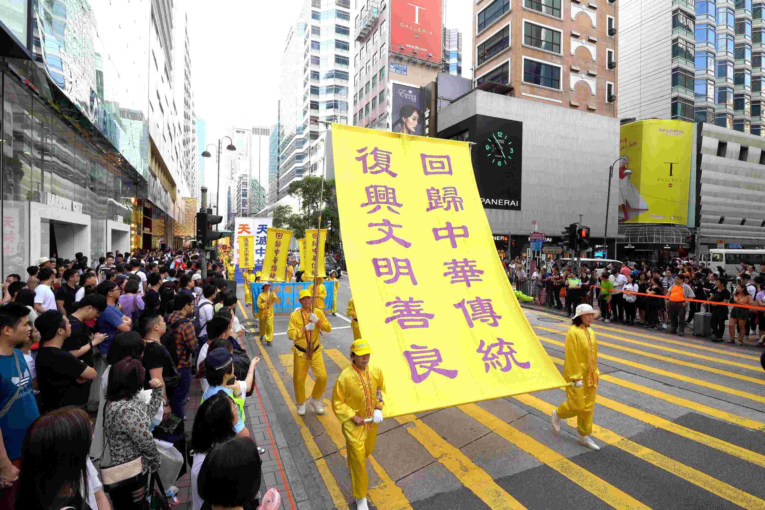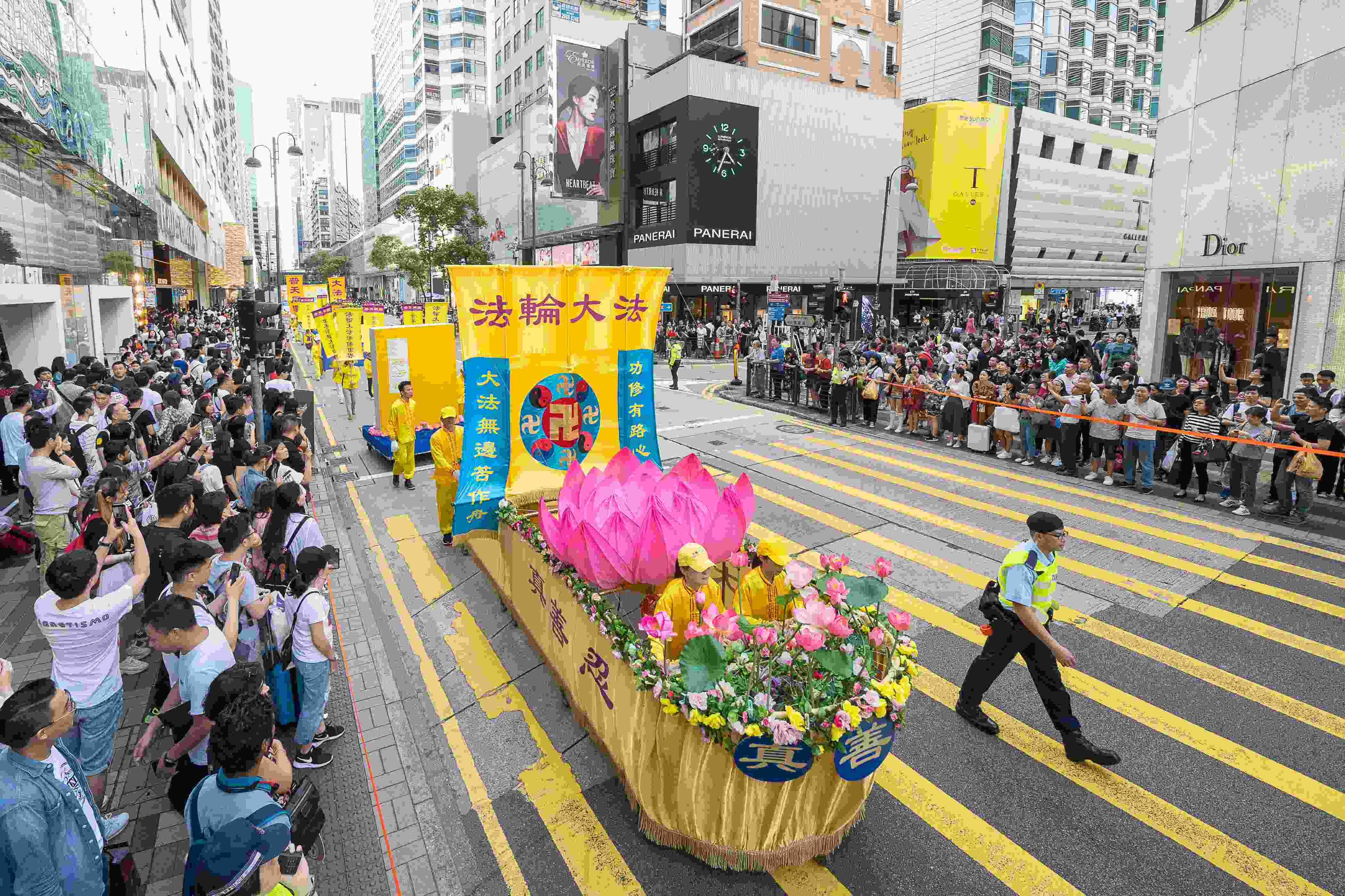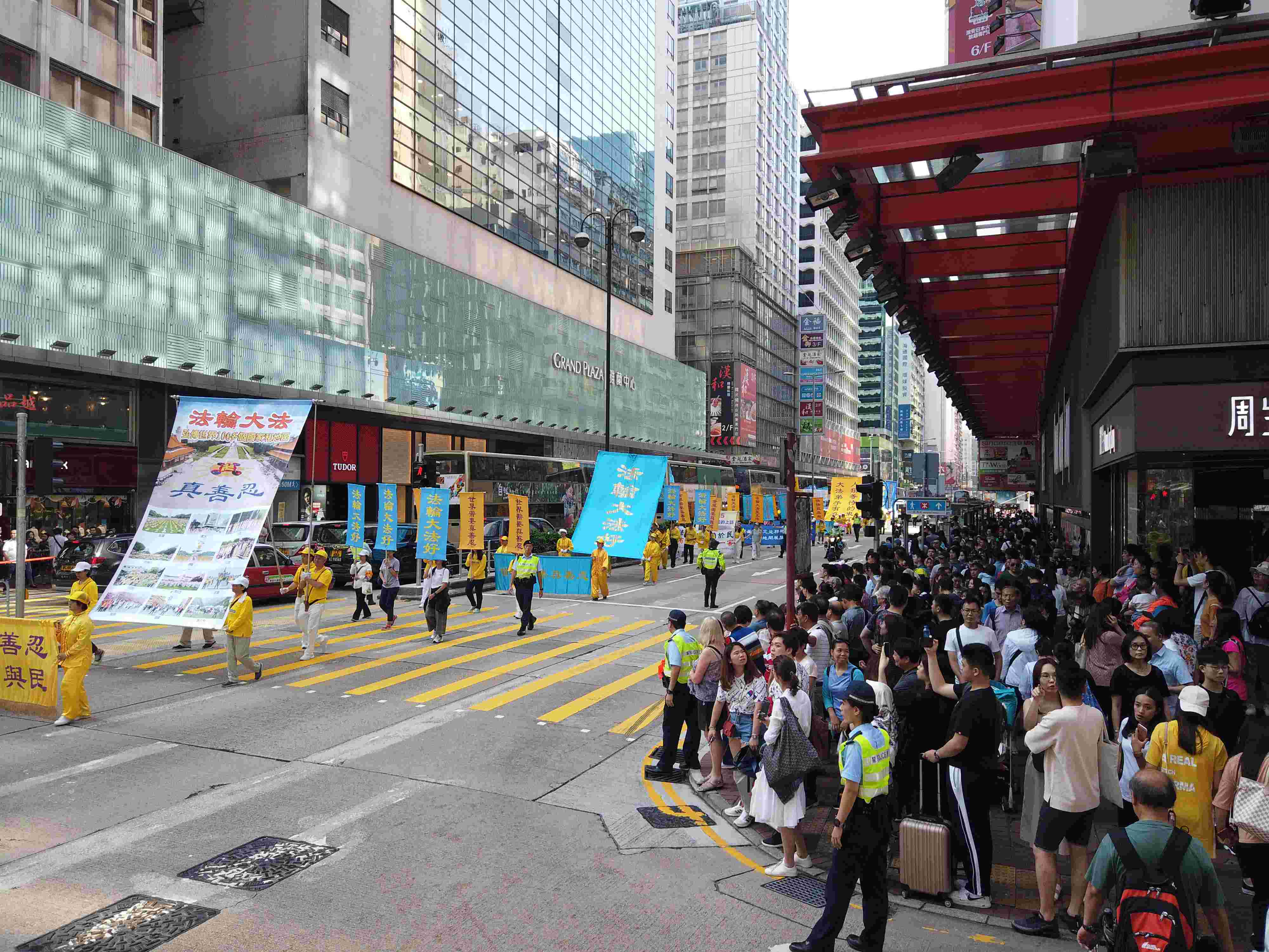 下午二时,游行队伍在天国乐团领头下,从长沙湾游乐场出发,途经旺角弥敦道、尖沙咀广东道等购物热点,前往终点尖沙咀码头。游行队伍中有各式幡旗横幅,加上腰鼓队、仙女队、功法演示队等表演,将法轮大法好、真善忍好的福音传扬给沿途的中外民众。适逢几天假日,有许多市民及大陆游客夹道观看游行。