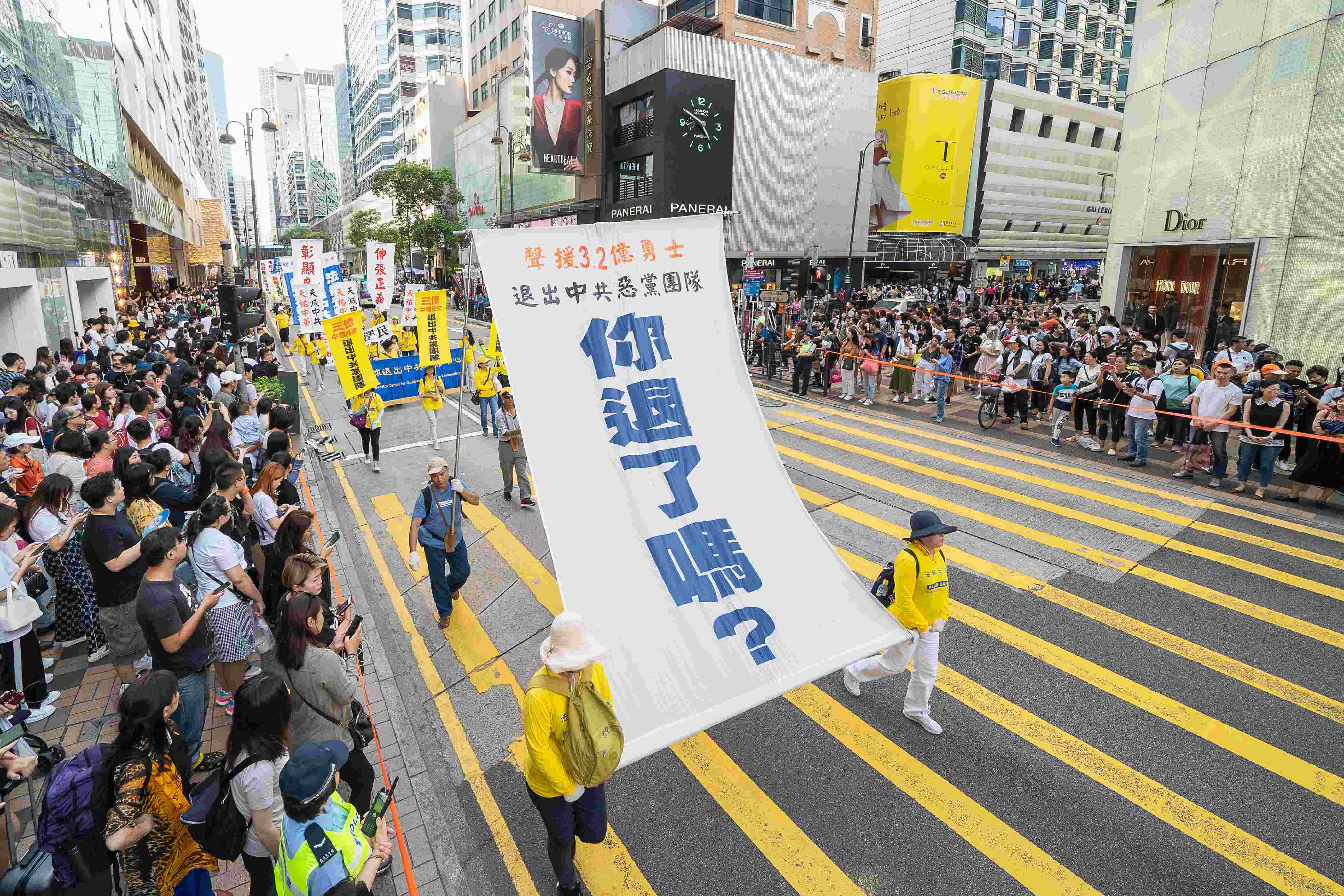 法轮功学员、三:退.(退出中共党团队组织,简称三:退.)义工谭太在佐敦和尖沙咀帮助观看游行的大陆游客退出中共党团队组织。在壮观的游行队伍前,谭太跟他们讲法轮大法弘传世界,还有中共迫害法轮功的罪恶、对法轮功学员打死当白打等真相。很多人刚看了法轮功的各式真相横幅,表示“我们都知道”,很容易便退了。她刚替一对青年男女退了,一转身旁边的人也马上愿意退!党!,“一讲就退,一讲就退,都表示明白。”