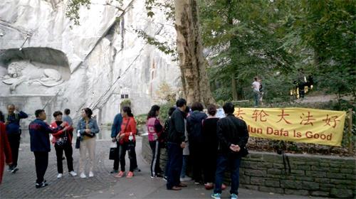 第二天,天国乐团去瑞士被誉为最美的城市——卢塞恩表演。我们也跟过去讲真相、发资料、劝三:退.。很多大陆游客一帮一帮的经过,我就跟着他们走,边走边把展板拿出来打开、播放器拿出来放,游客们也边走边听,有的还边看展板。我跟着他们来到一个景点:狮子纪念碑。