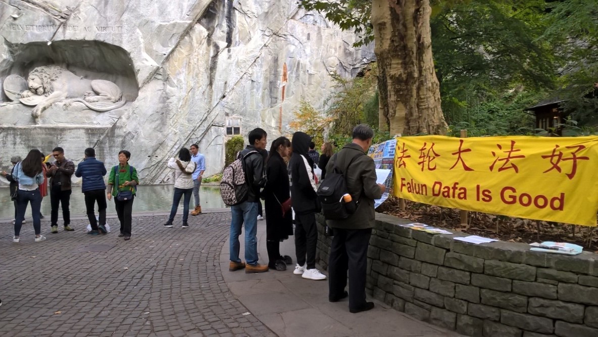 ![]() 游客在看展板、资料,了解法轮功真相(瑞士狮子纪念碑景点,2018年10月) |