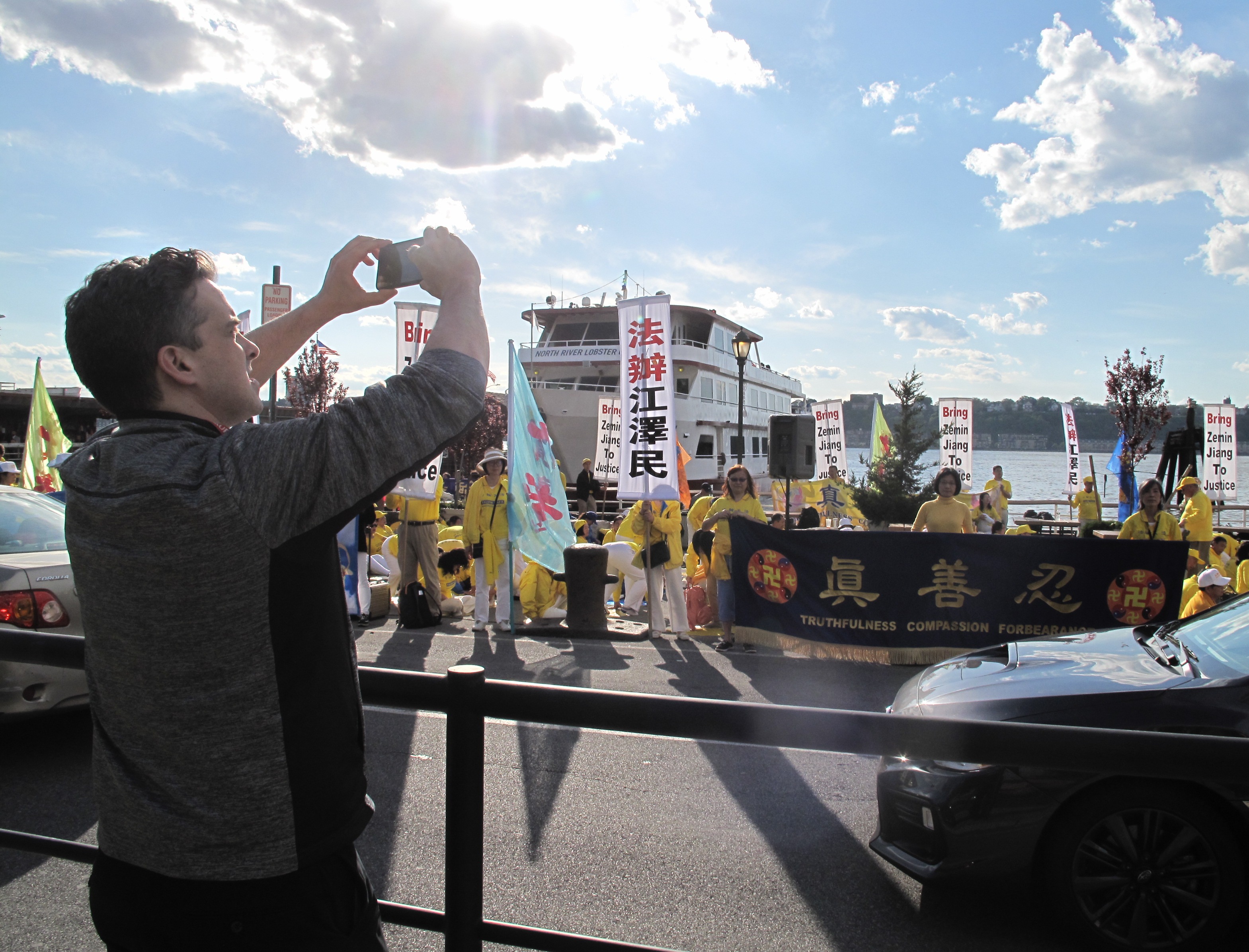 ![]() 一位在金融部门工作的纽约人被法轮功学员的和平抗议场面所吸引,他拿出手机认真录下眼前看到的壮观场面,表示要发给自己的朋友去看。 |