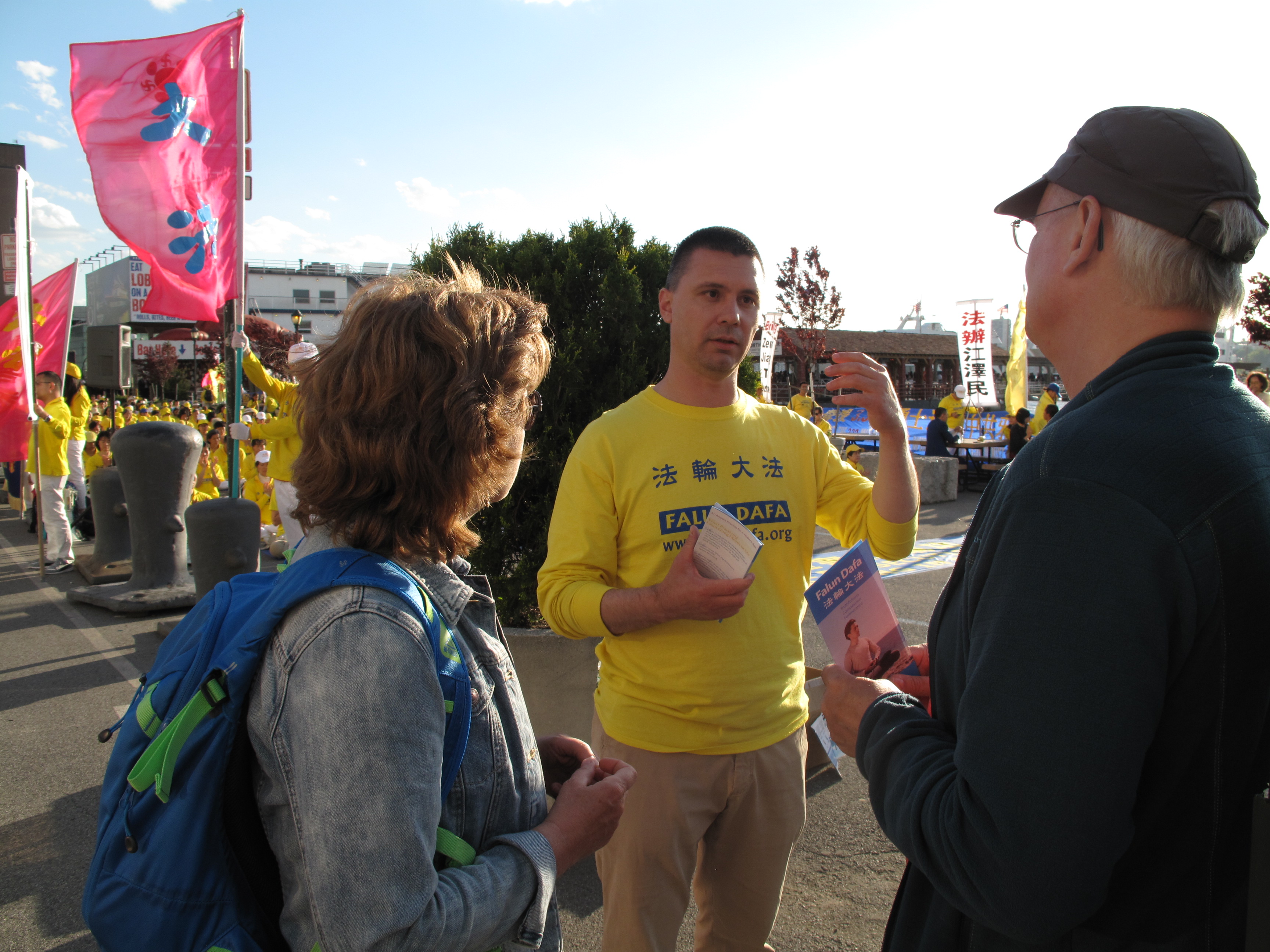 法轮功学员的抗议集会受到很多路人的关注和支持。