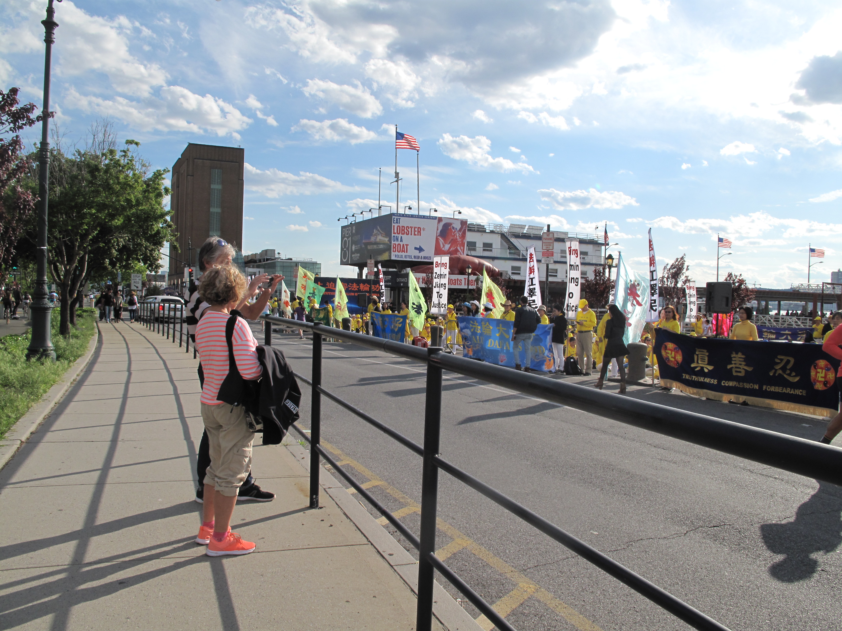 集会在下午四点半开始,法轮功学员身穿黄色T恤衫,在哈德逊河畔铺就一片金黄。学员展示“停止迫害法轮功”的立式横幅,十余个“法办江泽民”的中英文条目非常醒目。不断有外国游客问“江泽民”是谁,法轮功学员告诉他们,江泽民是出于个人嫉妒发起对法轮功迫害的罪恶元凶,中共迫害法轮功是因为它害怕法轮功的信仰“真善忍”,迫害正信的罪恶一定会受到天理报应。