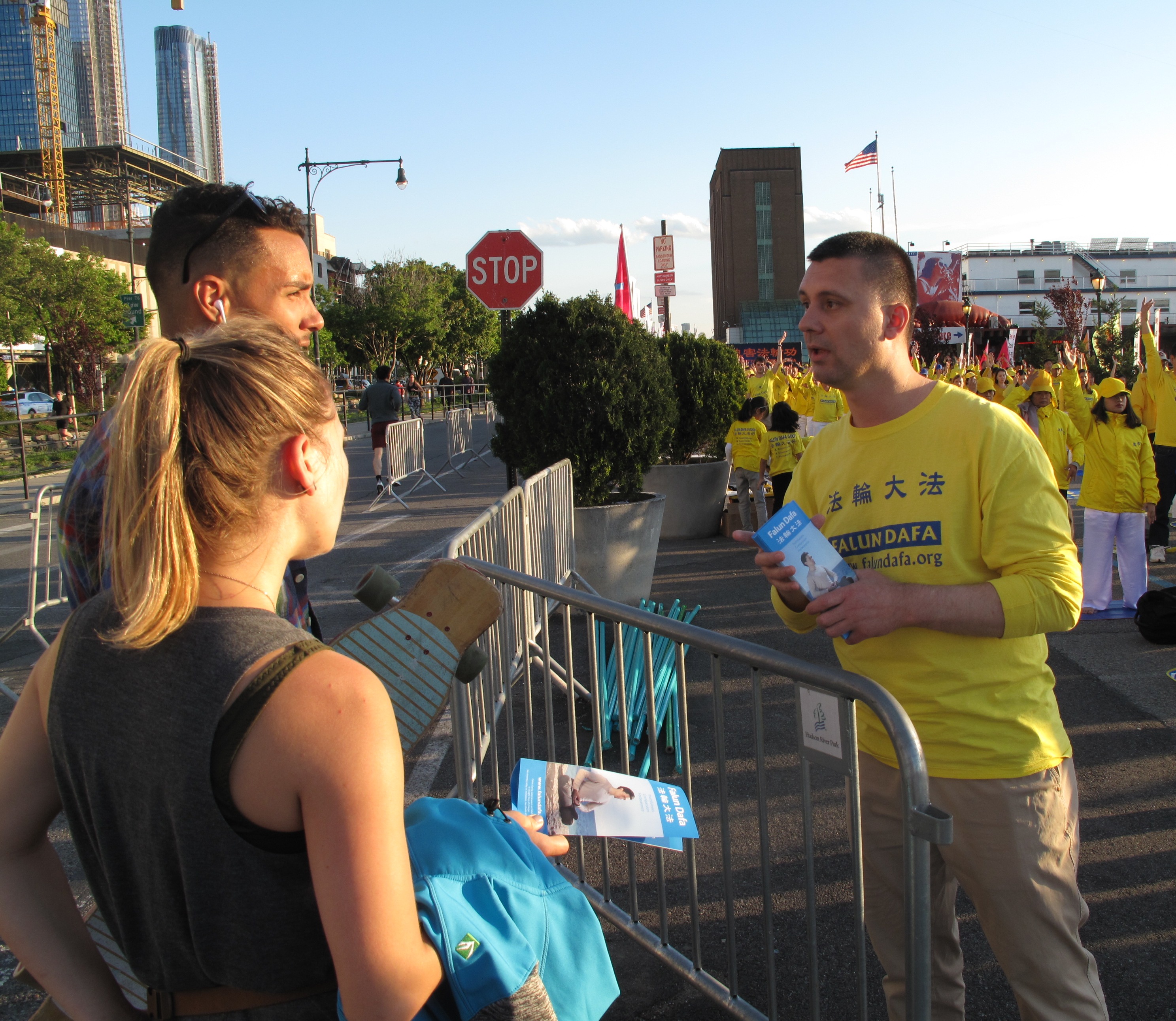 ![]() 现居美国纽约的法轮功学员Dorin,集会过程中他一直在向路人发传单讲真相。 |