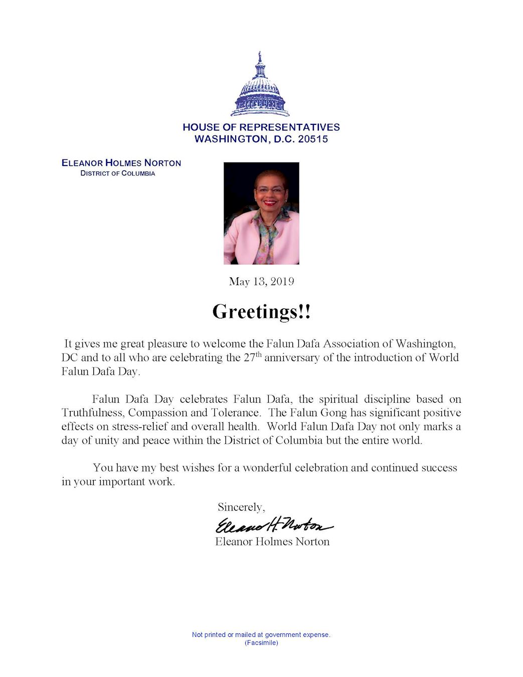 ![]() 图:美国首都华盛顿哥伦比亚特区联邦众议员埃莉诺·霍姆斯·诺顿(Eleanor Holmes Norton)的贺信。 |
