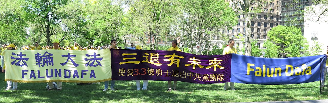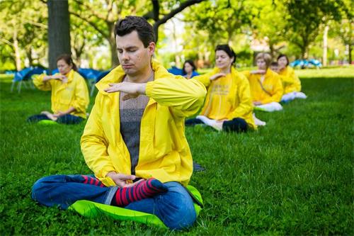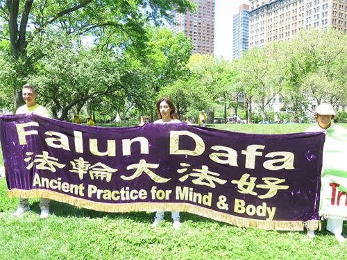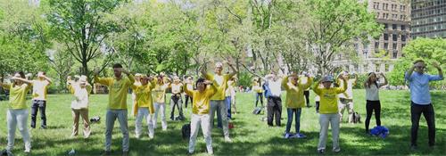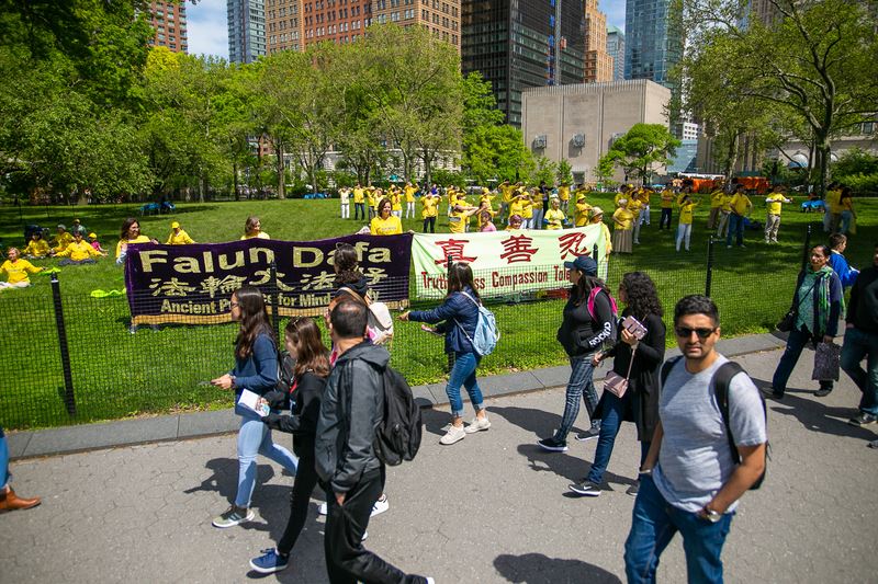 五月十八日部份法轮功学员来到位于曼哈顿最南端的炮台公园(Battery Park)集体炼功,尽管周围喧嚣嘈杂,时不时的还有直升机马达的隆隆声和呼啸而过的应急车辆的警报声。但是炼功场上法轮功学员随着祥和的炼功音乐舒缓的炼功景象,与周边的环境形成了鲜明的对比。通向自由岛渡船的通道上行人络绎不绝,许多人驻足观看,也有人向法轮功学员了解什么是法轮功,还有的人坐在公园的长凳上享受片刻的宁静。
