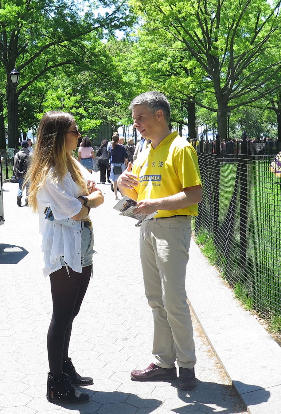 波多黎各工程师瑞切尔(Rachel)带着女儿到纽约旅游,法轮功学员的炼功场面吸引了她。法轮功对她来说并不陌生:“我在今年波多黎各的素食节上看到过法轮功,他们在那里介绍法轮功。我的理念与他们的很相似。”瑞切尔对中共政权迫害法轮功学员也有所了解,对于这种迫害瑞切尔的回答是:“我认为法轮功是一件美好的事物。对我来说你们非常祥和。善是很好的价值。”