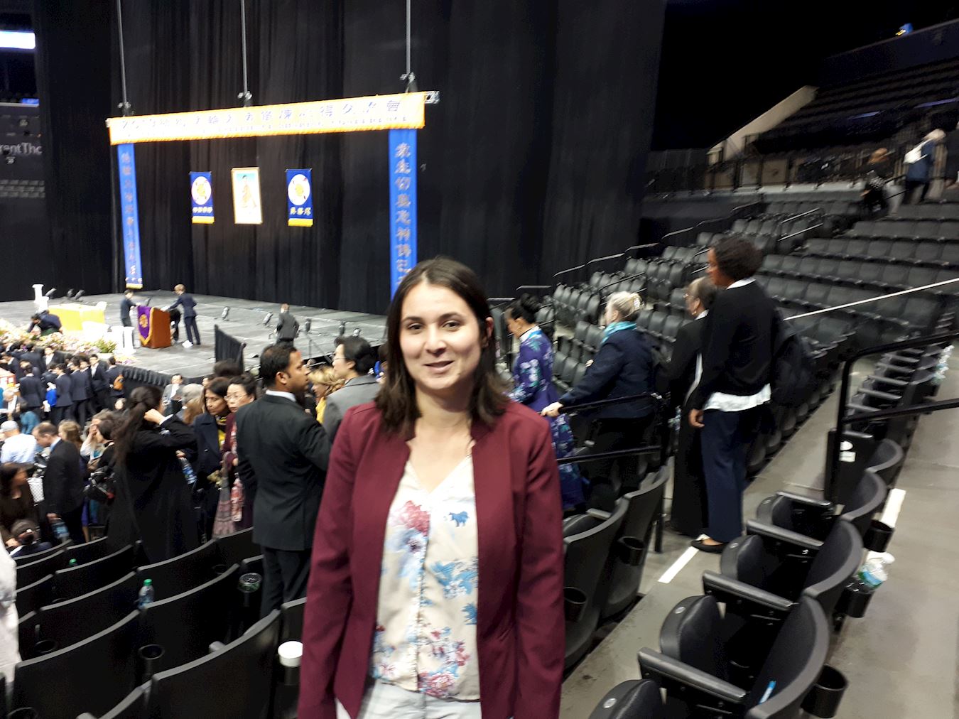 ![]() 图5:法国青年大法弟子卡密尔(Camille Avias)在二零一九年纽约法会上。她说:“这是我第一次见到师父,我感到非常幸福。” |